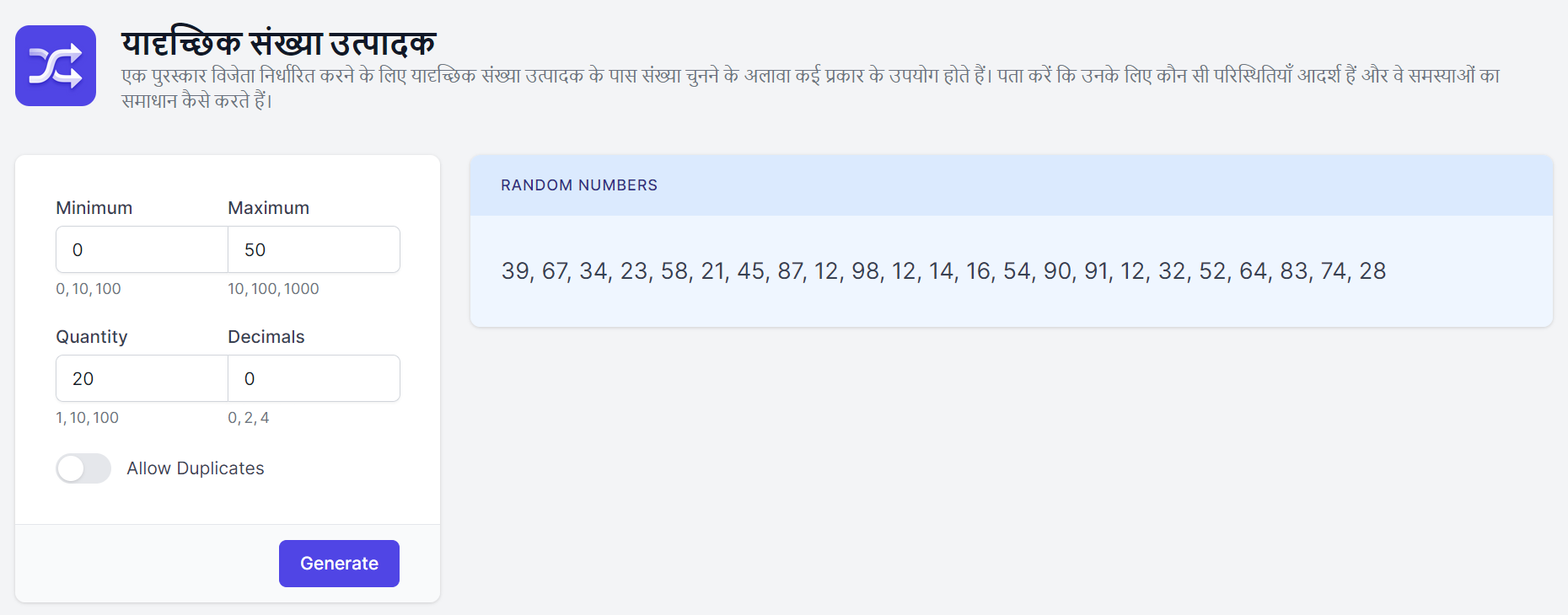 यादृच्छिक संख्या उत्पादक की आवश्यकता उन लोगों को हो सकती है जो निर्धारित सीमा के भीतर यादृच्छिक संख्याएं उत्पन्न करने की इच्छा रखते हैं। यह उपकरण उपयोगकर्ताओं को संख्याओं की यादृच्छिकता को समझने और उसे अपने उपयोग में लाने में मदद करता है।