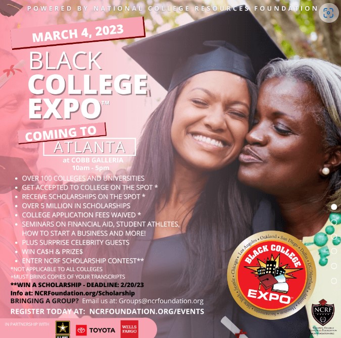ATLANTA, GEORGIA, UNITED STATES, February 25, 2023 /EINPresswire.com/ — National College Resources Foundation is proud to announce the 19th Annual Atlanta Black College Expo™ Saturday, March 4, 2023 at the Cobb Galleria Centre, 2 Galleria Parkway SE, Atlanta, Georgia 30339 from 10 a.m. to 5 p.m. The expo celebrates the rich heritage and NCRF’s long-time partnerships with historically black colleges and universities (HBCUs). Attendees can meet with over 80 colleges, including HBCUs and other colleges, participate in workshops from 10 a.m. to 3 p.m. and stay for an After Show from 3 p.m. to 5 p.m., hosted by celebrity guests.