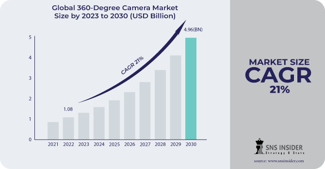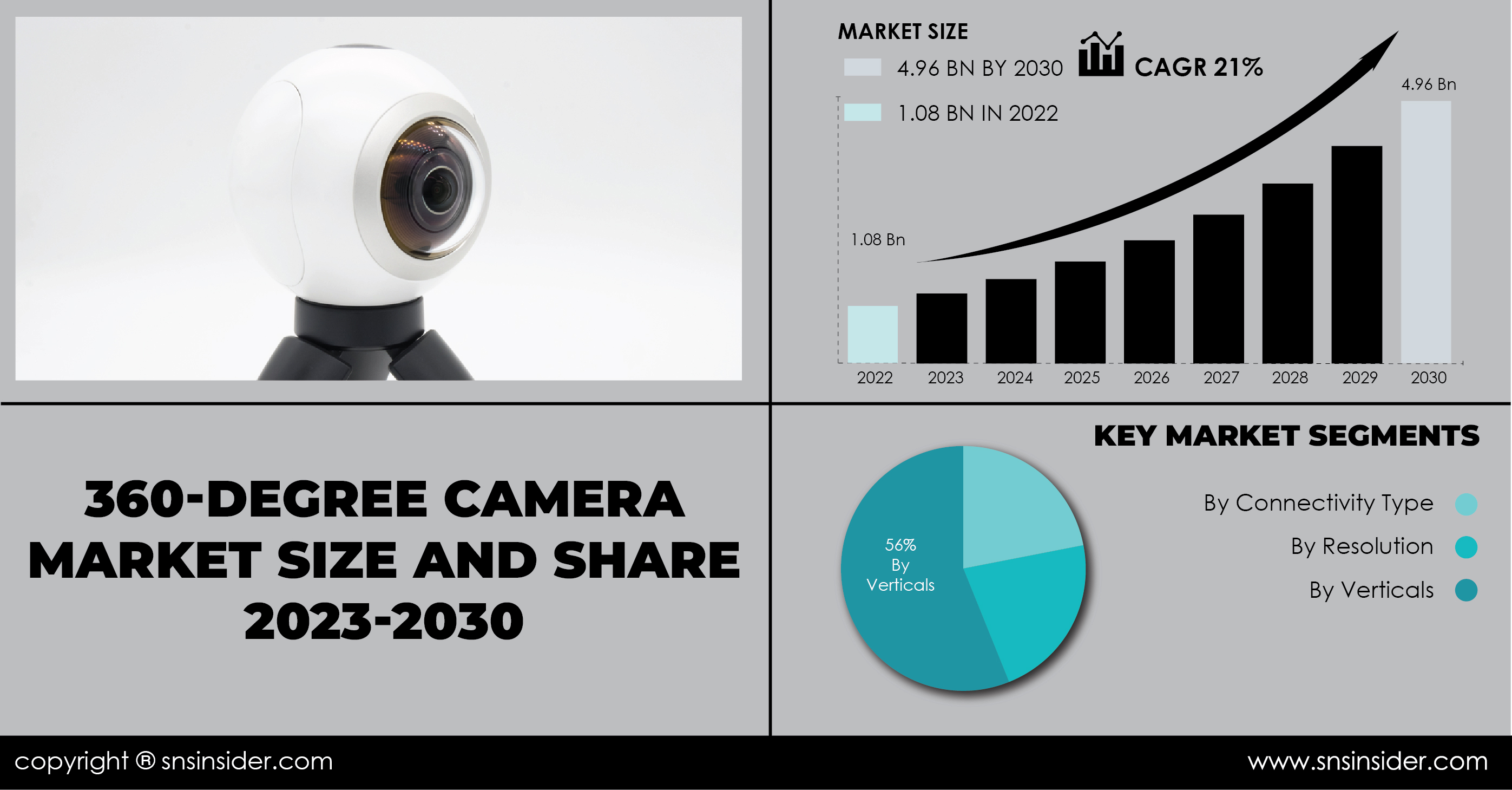 The size of 360 Degree Camera Market, as indicated in the SNS Insider report, achieved a valuation of USD 1.08 billion in 2022. Projections anticipate a significant growth, reaching USD 4.96 billion by 2030, with a projected Compound Annual Growth Rate (CAGR) of 21% during the forecast period spanning from 2023 to 2030.