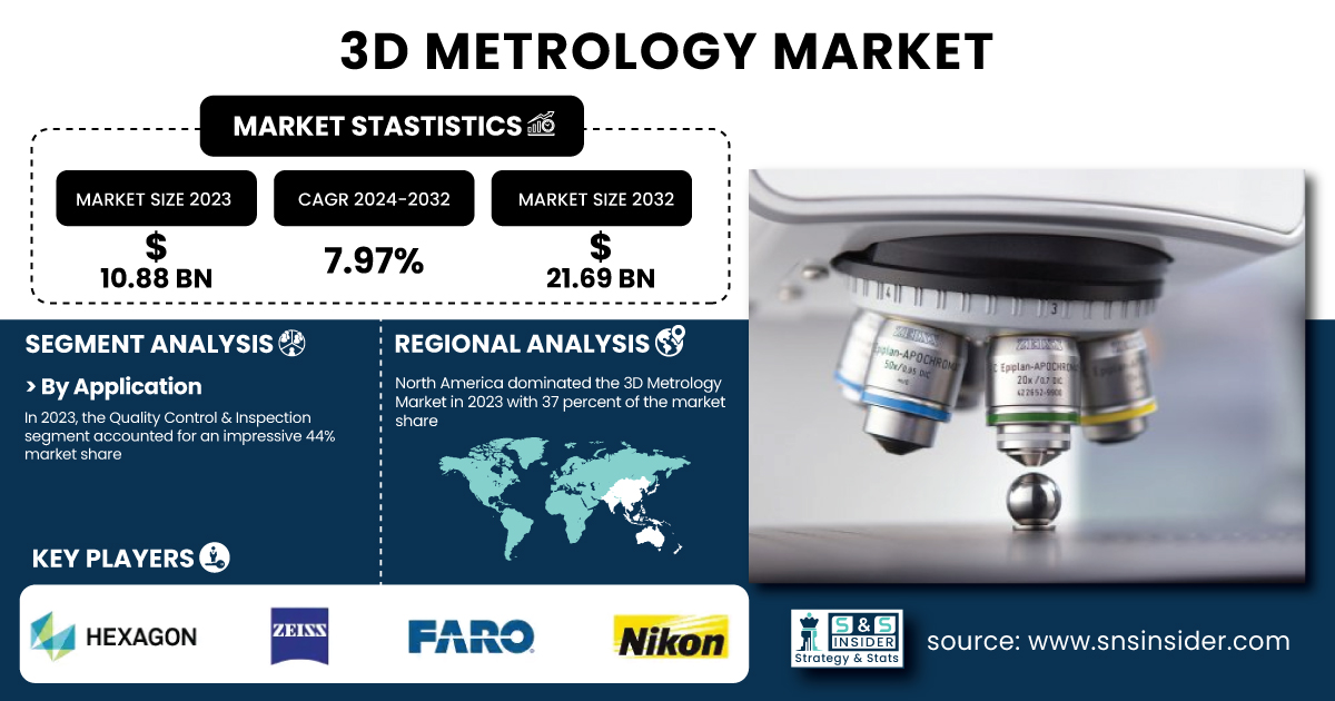 According to the SNS Insider Report,“The 3D Metrology Market size was USD 10.88 Billion in 2023 and is expected to reach USD 21.69 Billion by 2032, growing at a CAGR of 7.97% over the forecast period of 2024-2032.”