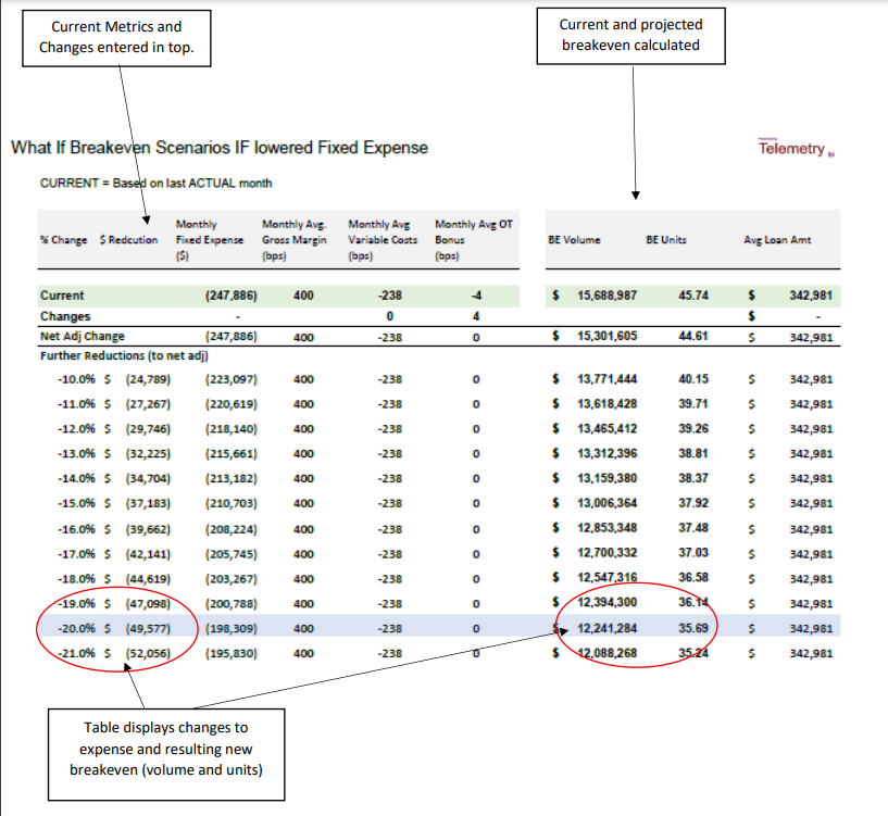 Using closed loan counts, financial data, and a list of changes (e.g. margins, bonus plans, fixed expenses, recurring vendor services, etc.) the tool provides a report that shows “what if” scenarios including a matrix of cost-cutting to help guide decisions. Then 5X Solutions will follow up for three months until the cost-cutting measures have been realized to their fullest extent.