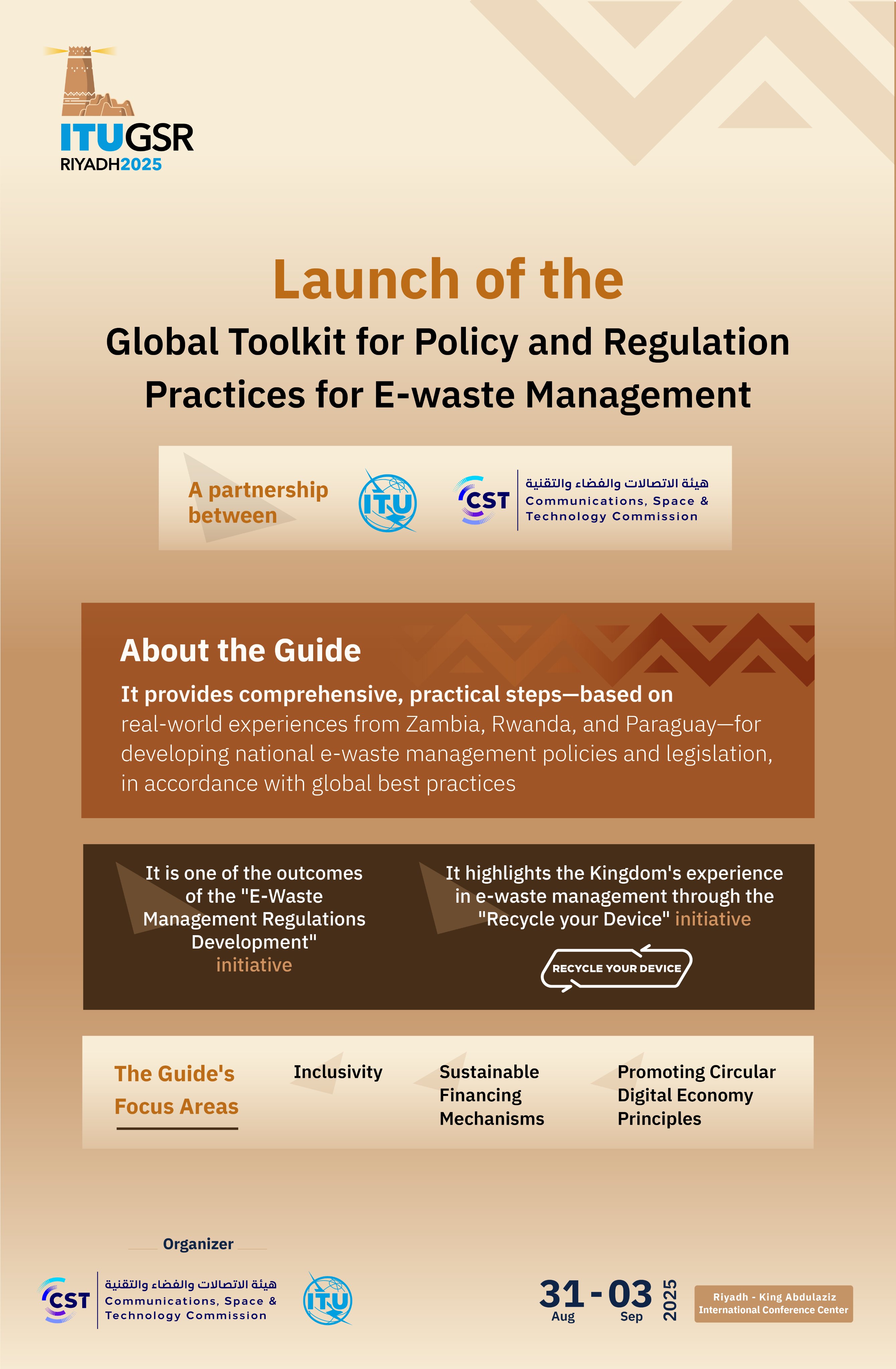 The announcement builds on CST and ITU’s earlier “Developing E-Waste Management Regulations” initiative launched at GSR23, and is part of Saudi Arabia’s broader efforts to advance the UN Sustainable Development Goals (SDGs). Together, these projects aim to shape global standards and regulations that can reduce the growing environmental burden of digital technologies.