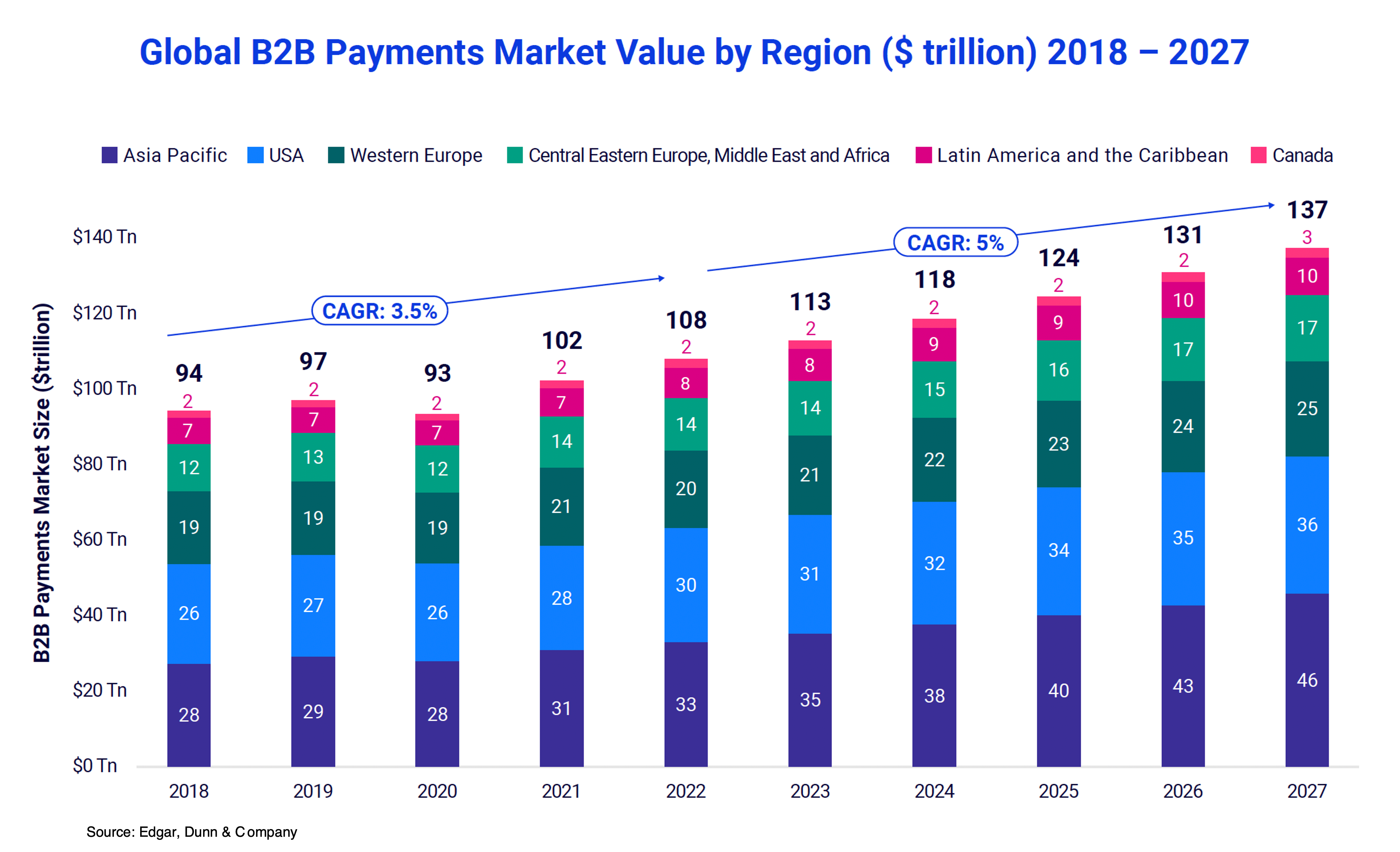 Due to Covid-19, the size of the global B2B payments market decreased by 4% between 2019 and 2020 and the recovery has been slowed by the conflict in Ukraine. However, the market has experienced a strong rebound and EDC estimates that the global B2B payments market will grow from $113 trillion in 2023 to $137 trillion in 2027 with a compound annual growth rate of 5%.