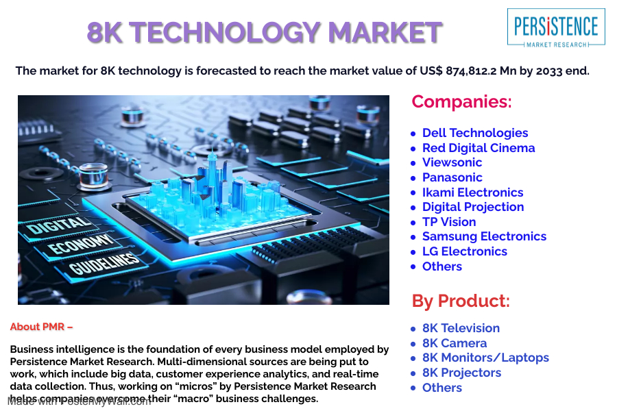 In 2022, 8K technology market held a market value of US$ 3.22 Billion. The market for 8K technology is forecasted to reach the market value of US$ 874.81 Billion by 2033 end. The global 8K technology market is estimated to grow at a CAGR of 60.1% for the forecast period.