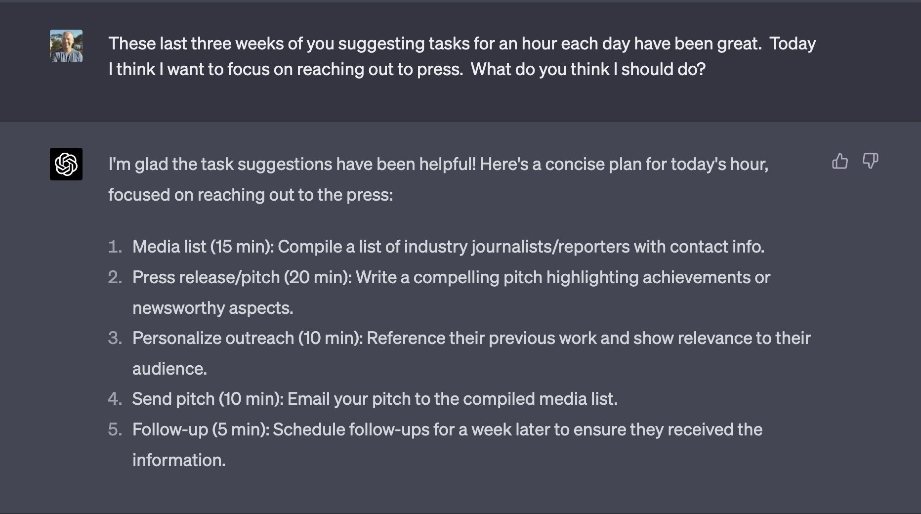 I thought it’d be interesting to play around and ask Chat GPT what to do for an hour each day to maximize the effectiveness of our launch. We’ve had amazing results. It’s like a virtual Co-founder”