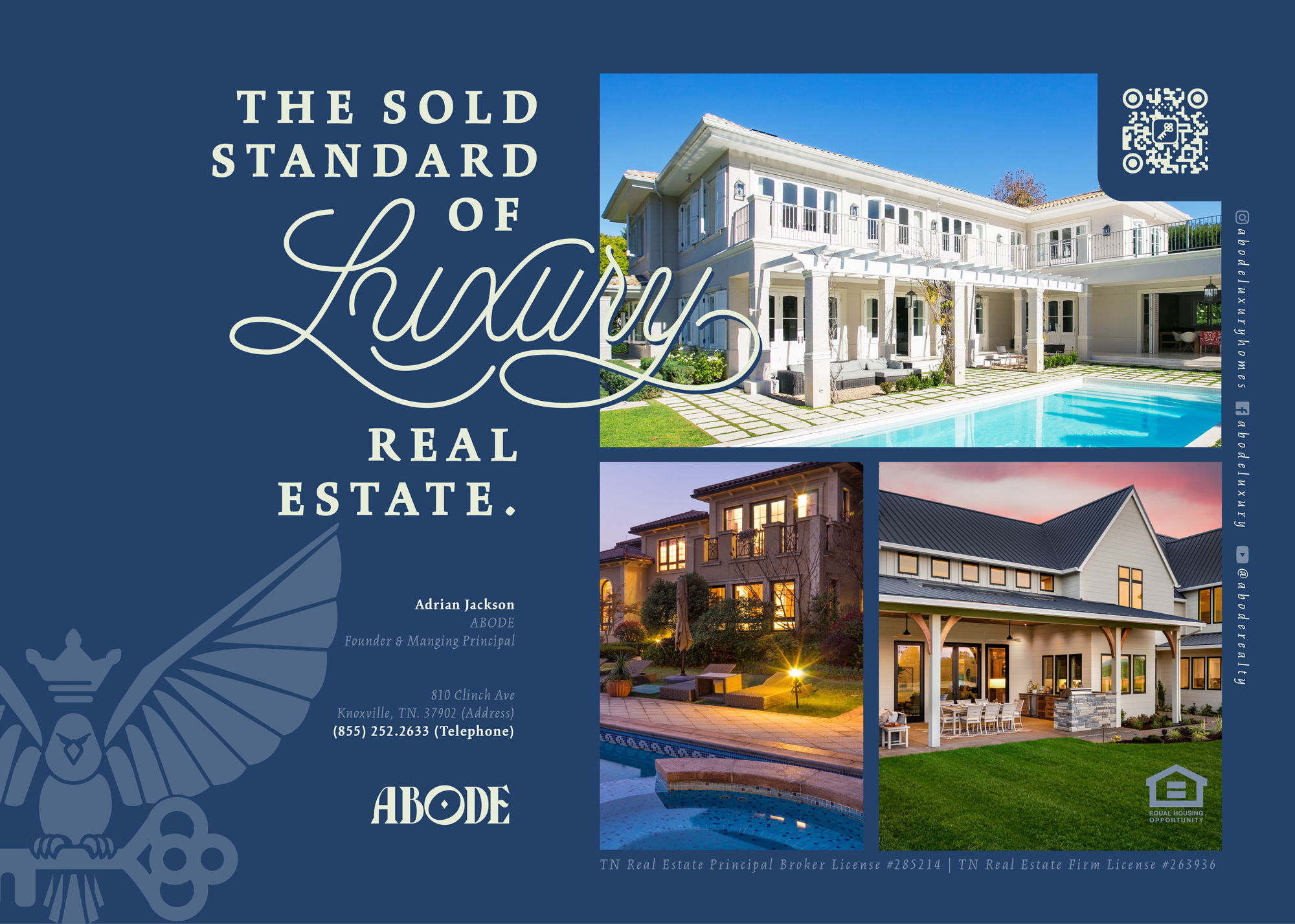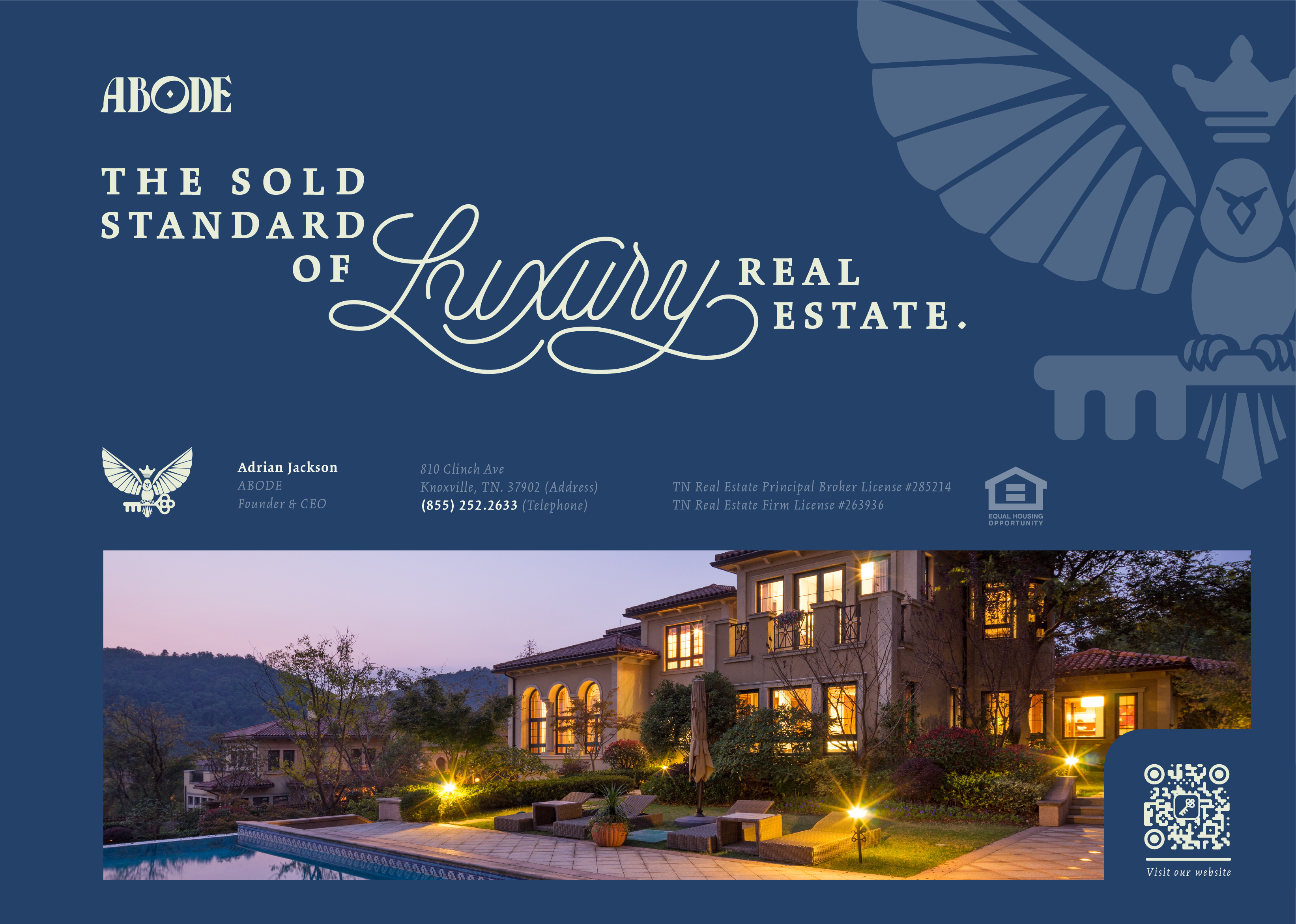 About ABODE Luxury Real Estate Company: ABODE is a premier luxury real estate company specializing in high-end properties in Farragut, Knoxville, and the surrounding areas. Led by founder Adrian Jackson, ABODE delivers exceptional service, expert market knowledge, and an exquisite portfolio of luxury properties. With a focus on meeting the unique needs of luxury homebuyers and leveraging their mastery of real estate marketing for sellers, ABODE is redefining the luxury real estate experience.