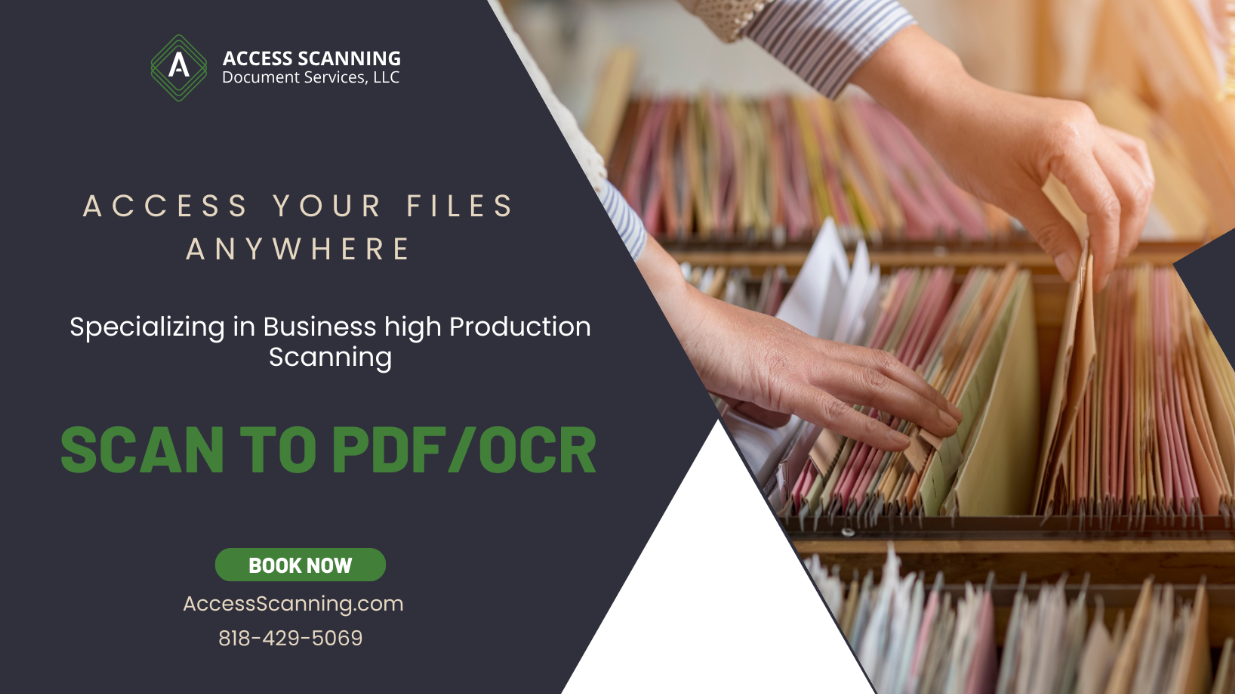 16001 VENTURA BLVD., #115, ENCINO,, CA 91436, USA, August 12, 2024 /EINPresswire.com/ — Access Document Scanning Services, LLC, a leading document scanning service based in Encino, CA, is at the forefront of revolutionizing document management with its cutting-edge scanning solutions. The company specializes in converting physical documents into digital images, offering a secure, efficient, and environmentally friendly approach to managing records. With a strong commitment to confidentiality and HIPAA compliance, it provides solutions tailored to meet the diverse needs of various industries, including legal, medical, entertainment, manufacturing, insurance, transportation, real estate, banking, and more.