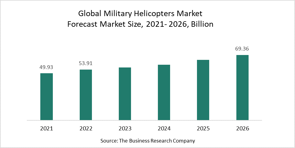 The global military helicopters market size is expected to grow from $49.93 billion in 2021 to $53.91 billion in 2022 at a compound annual growth rate (CAGR) of 8.0%. The growth in the military helicopters market is mainly due to the companies rearranging their operations and recovering from the COVID-19 impact, which had earlier led to restrictive containment measures involving social distancing, remote working, and the closure of commercial activities that resulted in operational challenges. The military helicopter market is expected to reach $69.36 billion in 2026 at a CAGR of 6.5%.