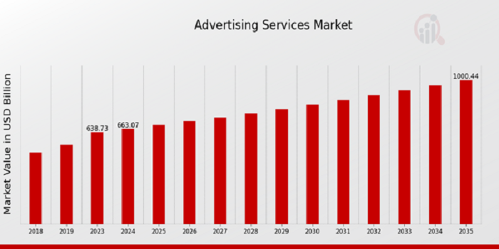 NEW YORK, NY, UNITED STATES, March 17, 2025 /EINPresswire.com/ — According to MRFR analysis, the Advertising Services Market was valued at approximately USD 638.73 billion in 2023. The industry is projected to grow from USD 663.07 billion in 2024 to USD 1,000.0 billion by 2035, reflecting an estimated CAGR of 3.81% during the forecast period from 2025 to 2035.