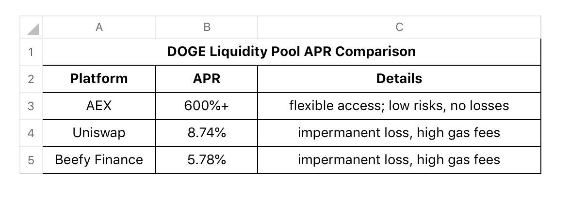 AEX introduces the DOGE liquidity pool with the highest APR on the market with 0 gas fees and a quick receipt of interest