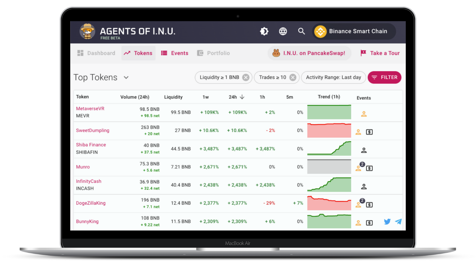 The Agents of I.N.U platform went into open beta on the 2nd of December, 2021, with the launch of the $AGENTSHIBAINU token on PancakeSwap, the most popular exchange on the Binance Smart Chain. The initial version of the product helped users search across all active tokens on the network, allowing them to hone in on tokens that match particular criteria.