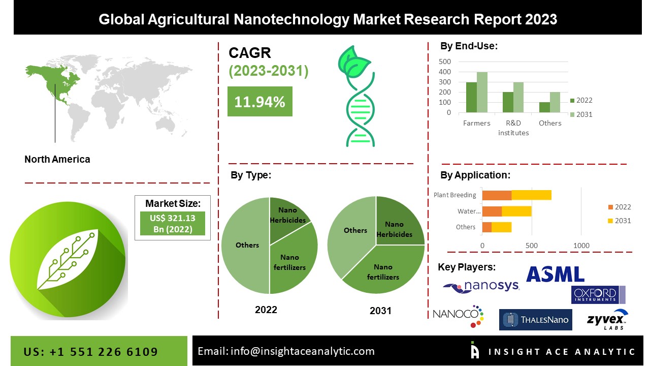 NEW JERSEY, SATTE NJ, USA, March 2, 2023 /EINPresswire.com/ — InsightAce Analytic Pvt. Ltd. announces the release of a market assessment report on the “Global Agricultural Nanotechnology Market Size, Share & Trends Analysis Report By Type (Nano Herbicides, Nano Fertilizers, Nano Pesticides, Nano Biosensors, Nanomaterials, And Others), Application (Crop Production & Protection, Water Purification, Recycling Agriculture Waste, Soil Improvement, Plant Breeding, And Diagnostic), And End Users (Farmers, R&D Institutes, Government Organizations And Others)- Market Outlook And Industry Analysis 2031″