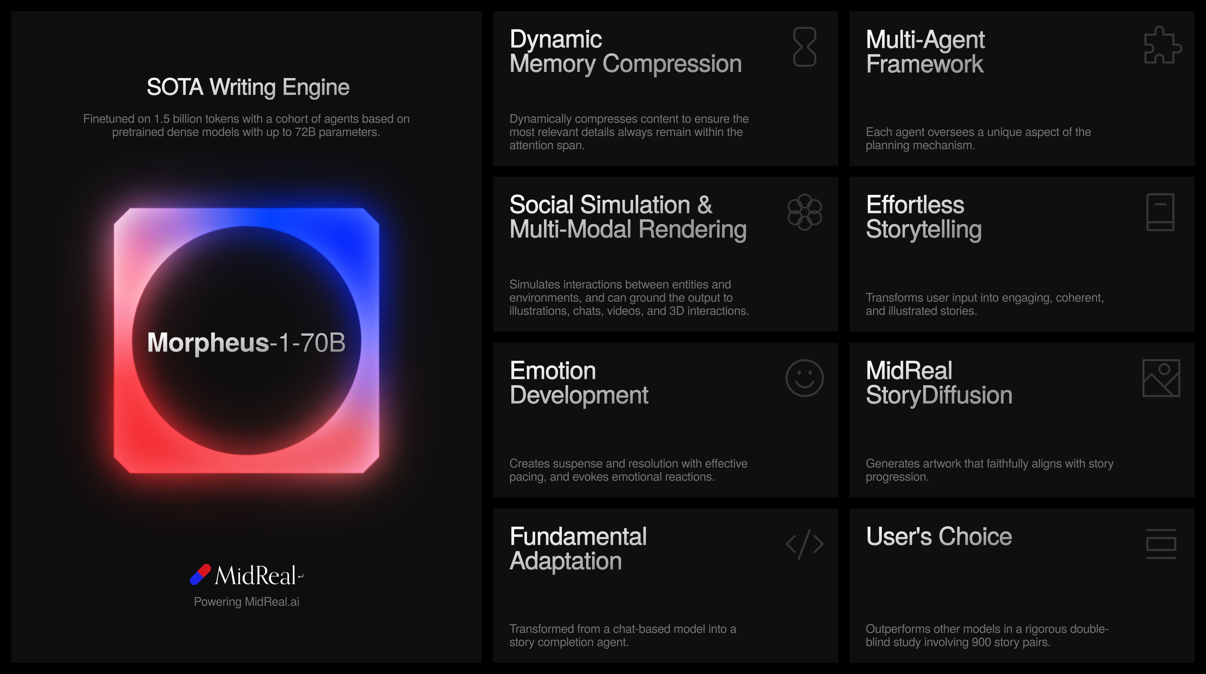 “In the world of AI driven narrative and storytelling, readability and believability is of paramount concern and that desire to give creatives the most state-of-the-art tools available is what drove us to create MidReal and its latest AI module “Morpheus-1,”” said Kaijie Chen, co-founder and CEO at MidReal. “With its official launch today we’re looking forward to the countless stories that are just waiting to be told to the world.”
