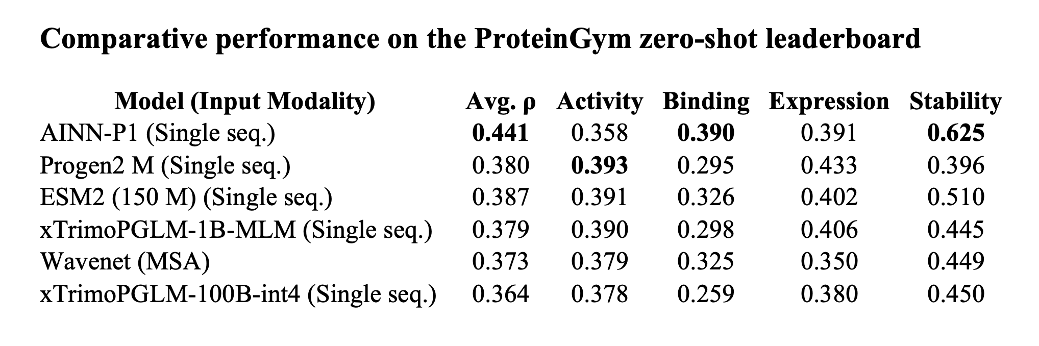 • Closing the binding gap: AINN-P1’s binding ρ = 0.390 exceeds ESM2-150M by 0.064 points, narrowing the historic advantage of structure-aware models.
