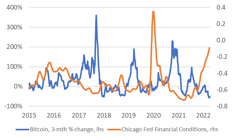 That is exactly what has been happening since the Fed “pivot” last November, when it began signaling that the period of easier monetary policy would begin to reverse. The accompanying chart shows a measure of financial conditions (produced by the Federal Reserve Bank of Chicago) and the percentage change in the price of bitcoin, measured over rolling 3-month horizons.