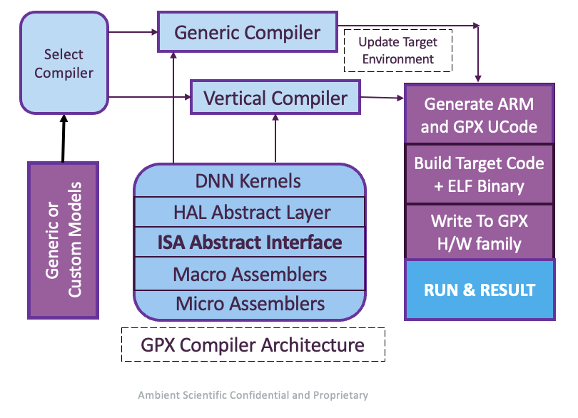 Ambient is releasing two types of compilers (i) Vertical Compilers that enable fast development of AI applications and (ii) A Generic compiler that provides programming flexibility to application developers for implementing AI models of their choice.