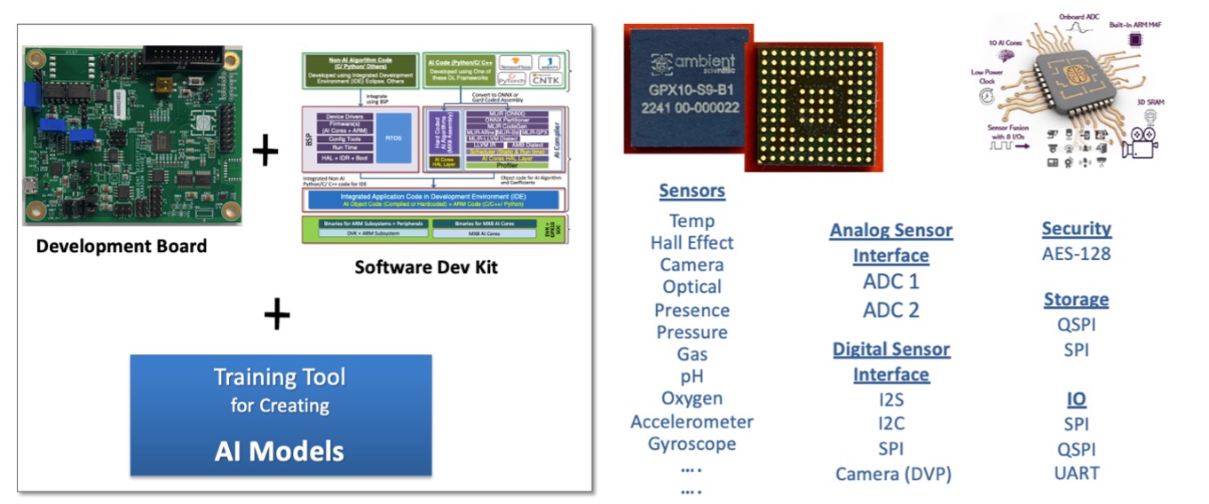 The market ready DIGANT.AI platform by Ambient Scientific provides a complete hardware and software solution. The high efficiency AI computing operation is made possible by DigAn™, our groundbreaking AI computing architecture powered by advanced custom circuit blocks including matrix-computer, 3D memories, asynchronous clocking schemes, etc. The DIGANT.AI platform includes a specially designed sensor fusion data path that is further enhanced by our proprietary Analog-to-Digital Converter (ADC) that can collect up to a million samples per second from multiple sensors simultaneously yet consumes only 5-microwatt of power with a rate of 20,000 Samples Per Second, which is unprecedented in this category. Developed as part of the DIGANT.AI platform, the GPX-10 processor can be dynamically programmed to operate with multiple operand resolutions from 4-bits to 32-bits, to balance power and accuracy. Based on application requirements, DIGANT.AI optimizations enable inference operations with power consumption as low as only 80-microwatt for voice and Sensor Fusion applications. Ambient Scientific’s GPX AI processors are true microprocessors that are exceptionally flexible to program. Using the advanced software stack included in the SDK, OEMs can differentiate their solutions with DIGANT.AI, a truly programmable AI platform.