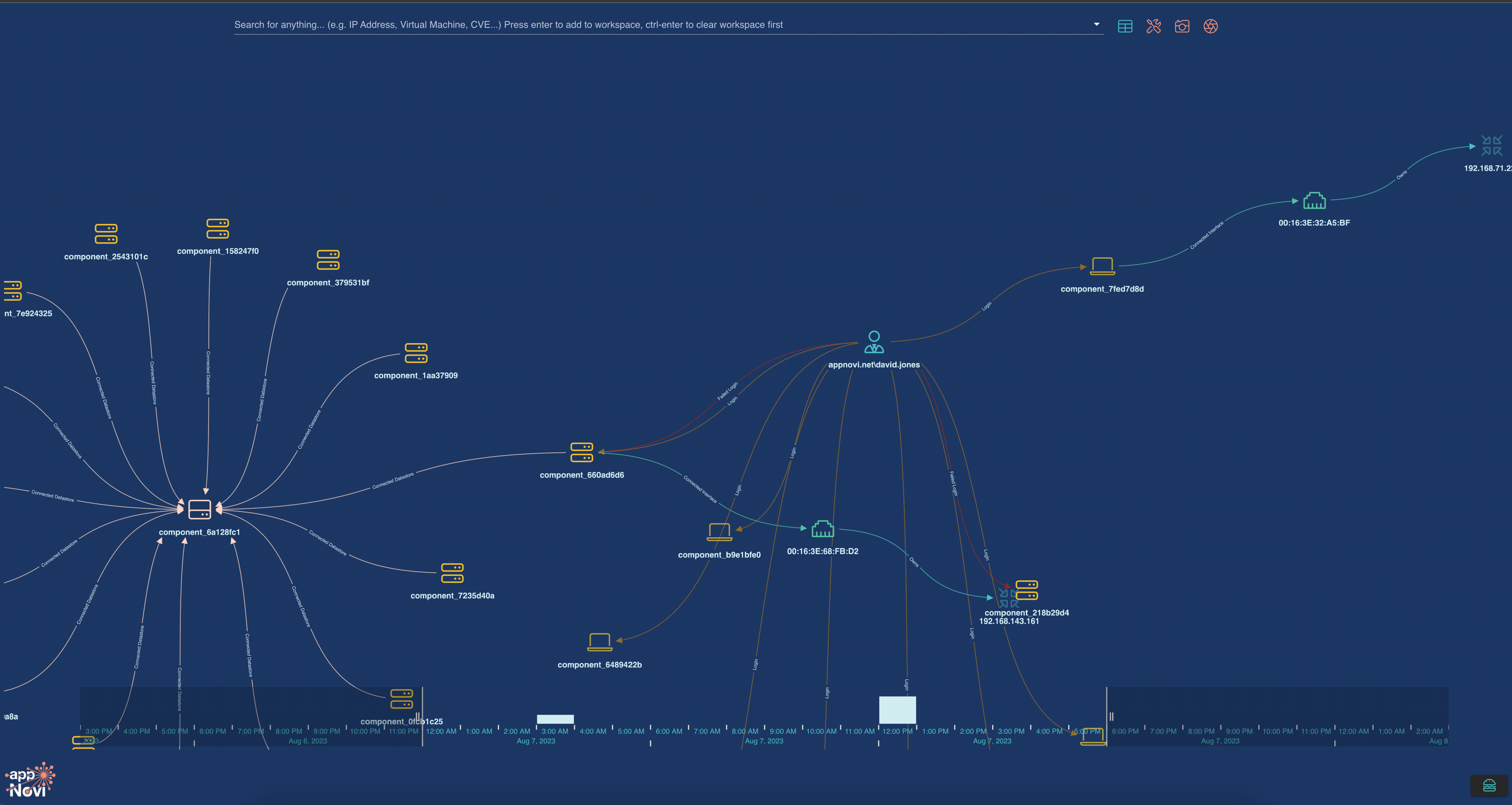 Upon receiving an alert, response teams can use appNovi to interrogate their entire enterprise dataset swiftly. They can identify an asset through the original alert and understand it’s context from all other data points, gauge the direct and indirect impact to applications, and trace the incident’s origin and subsequent pivot points.