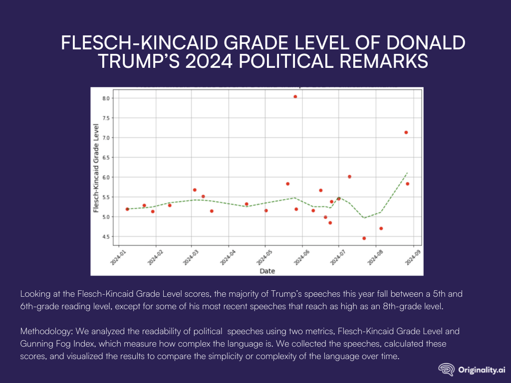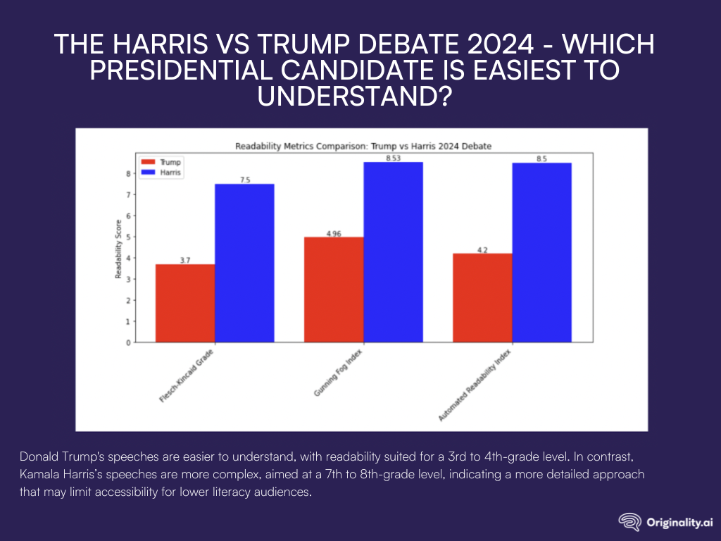 – During the 2024 debate, Trump’s speech had a Flesch-Kincaid score of 3.7, making it easier to understand than Harris’s score of 7.5.