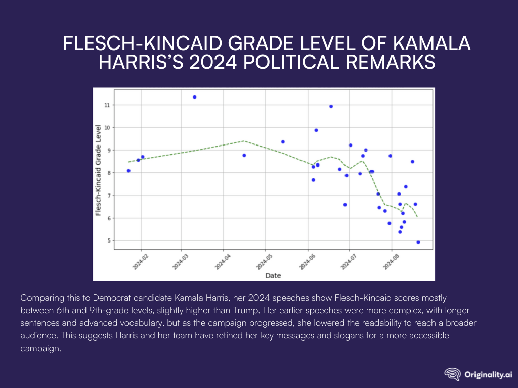 – Kamala Harris’s 2024 speeches are generally more complex, falling between 6th and 9th-grade levels, though she has simplified her language as the campaign progresses.