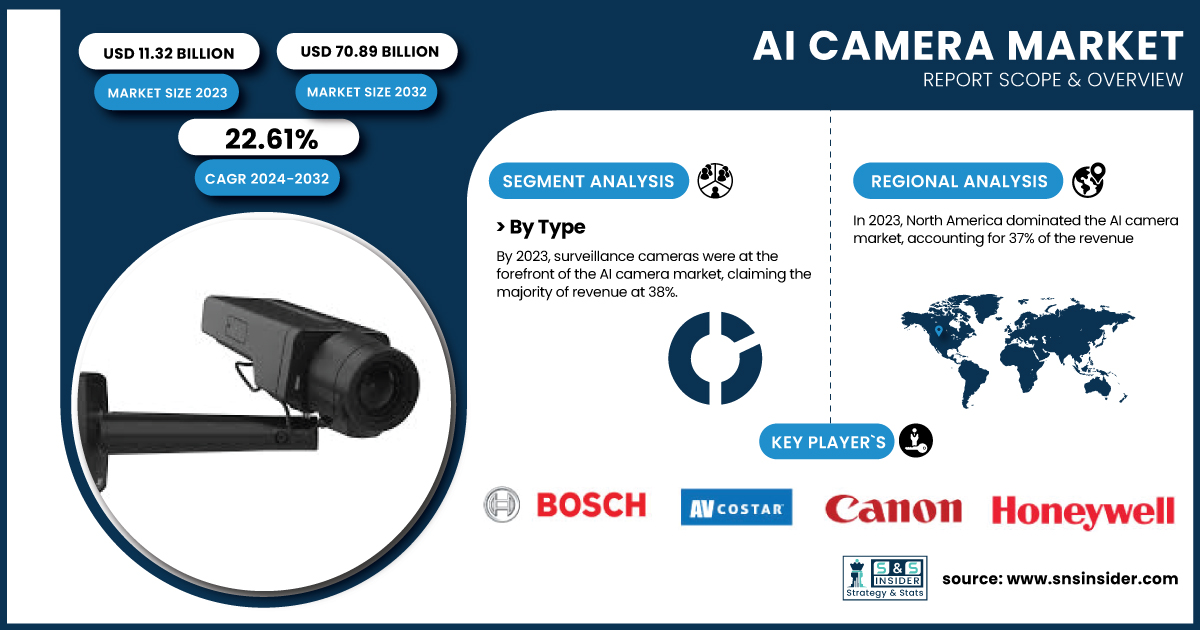 According to the SNS Insider Report,“The Artificial Intelligence (AI) Camera Market size was valued at USD 11.32 billion in 2023 and is expected to grow to USD 70.89 billion by 2032 and grow at a CAGR of 22.61% over the forecast period of 2024-2032.”
