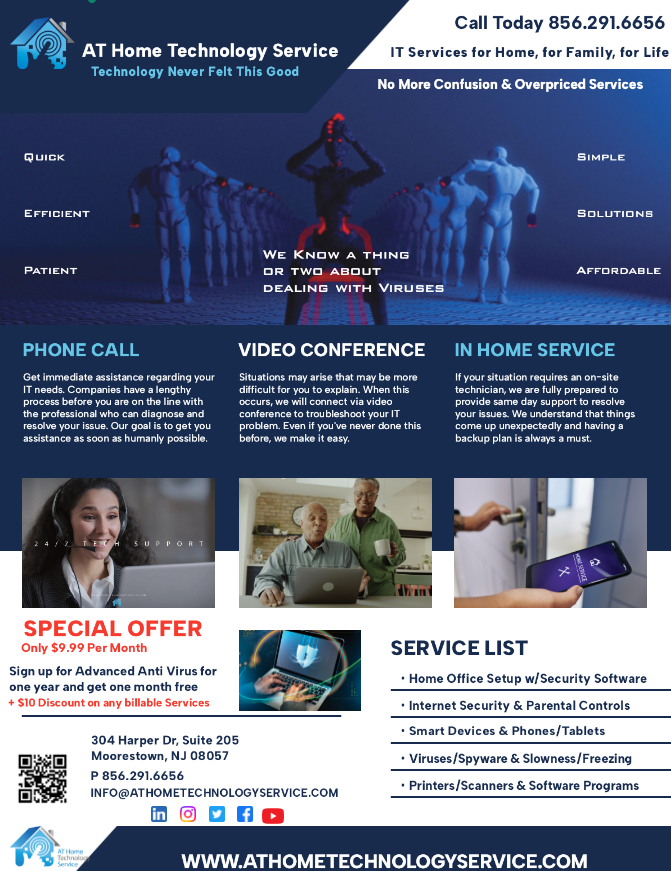 AT Home Technology Service offers a range of services including: computer setup and repair, network configuration and troubleshooting, virus and malware removal, data backup and recovery, internet security solutions, and smart home installation and setup. The company’s mission is to ensure that people can enjoy the benefits of technology without the stress and hassle of having to know it all.