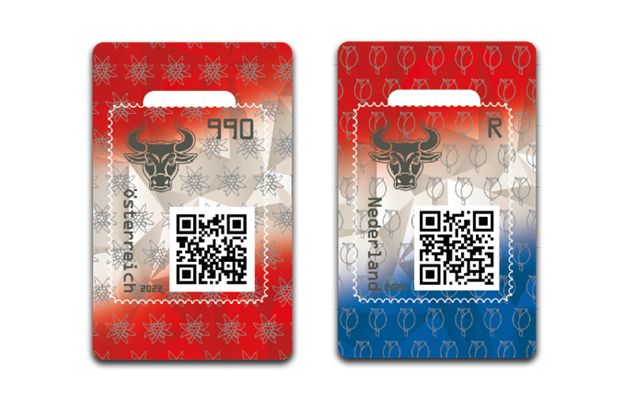 Both editions of the new 2022 Crypto stamp – in Austria “Crypto stamp 4.0”, in the Netherlands the “NL Crypto stamp” – share the same motif of the Bull. The bull is synonymous with optimism in the crypto and financial worlds and bull markets also mean rising prices. Leaving aside the motif, the two editions vary significantly in their design: The Netherlands edition comes in the national colors of red-white-blue and has a tulip, while the Austrian stamp is red-white-red and bears an edelweiss. Get them now at cryptostamp.com/onchainshop.