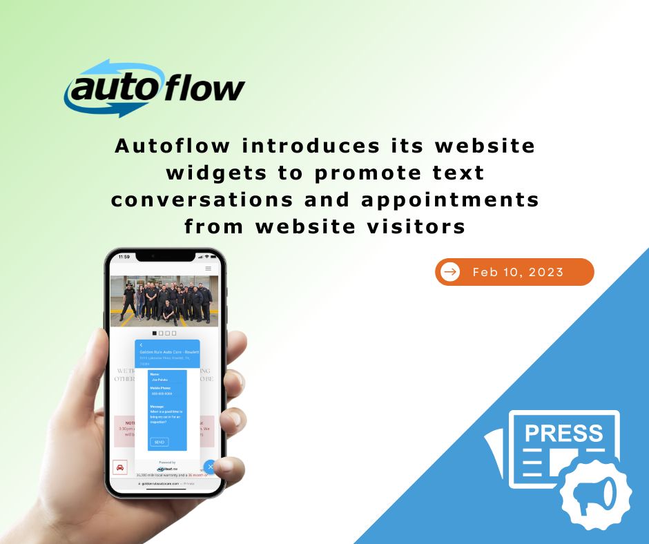 DALLAS, TEXAS, USA, February 10, 2023 /EINPresswire.com/ — Autoflow announces its website widgets that are designed to maximize the opportunity of turning website visitors into engaging text conversations and booked appointments. The chat-to-text widget enables real-time communication with service advisors, while the appointment scheduler widget allows appointments to be booked directly from the shop’s website and includes a custom pre-appointment questionnaire as well as a prompt to address prior declined services from previous Digital Vehicle Inspections (DVIs).