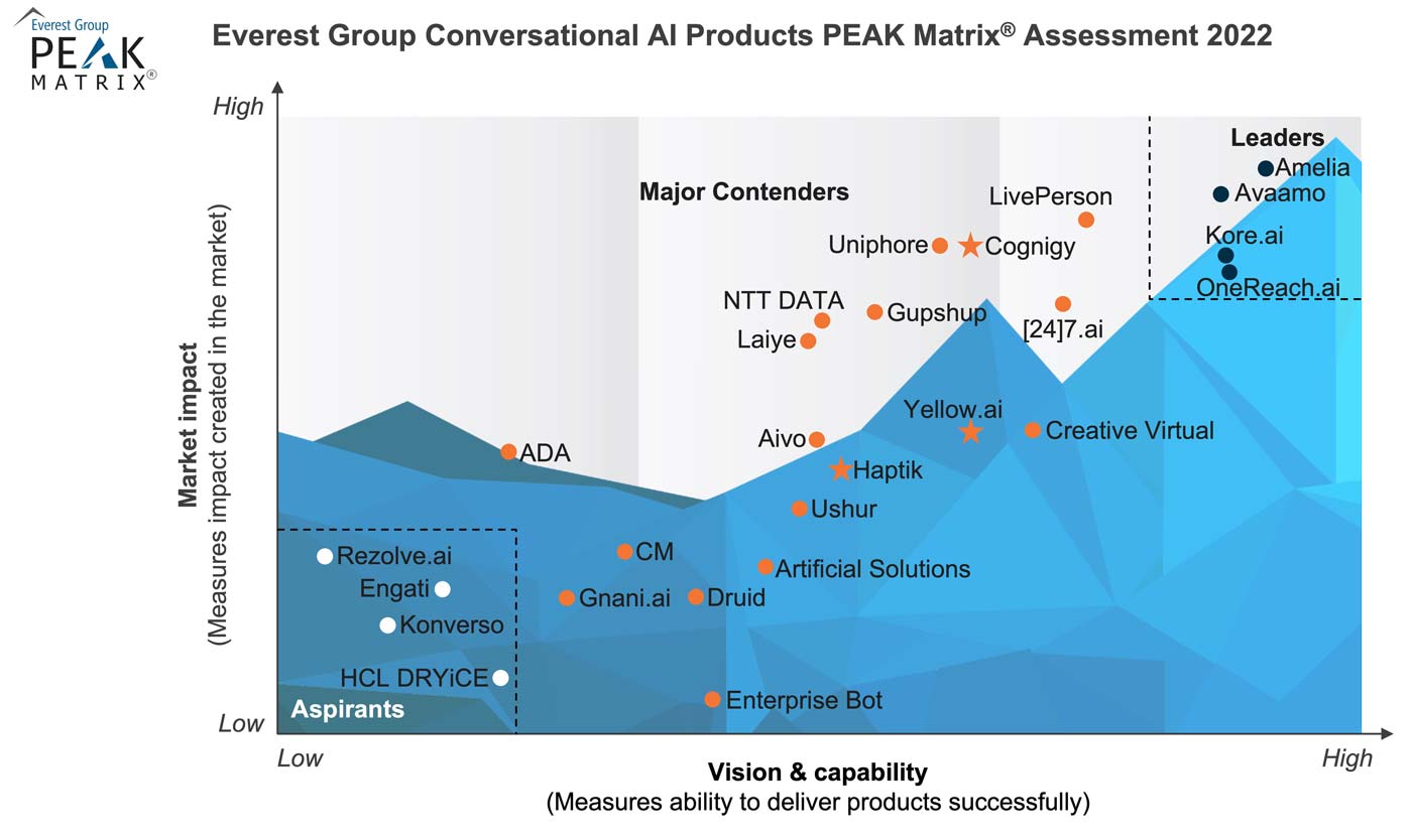 LOS ALTOS, CA, UNITED STATES, October 6, 2022 /EINPresswire.com/ — Avaamo, today announced that it has positioned as a Leader in the Everest Group report, “Conversational AI – Technology Vendor Landscape with Products PEAK Matrix® Assessment 2022”, for the third year in-a-row. Everest Group assessed 26 conversational AI technology providers and categorized them as Leaders, Major Contenders and Aspirants.
