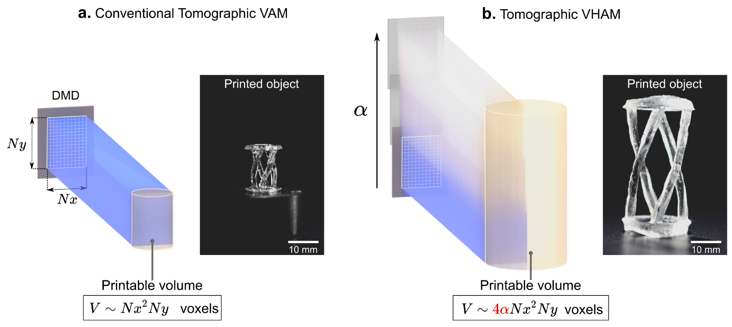 The team has presented a proof-of-concept of a new light-based technique for volumetric printing of multicentimeter scale objects. It builds up on tomographic VAM to significantly increase the number of printable voxels while keeping the same light modulating device for projection and without compromising too much the printing resolution. This was achieved by off-centering the light modulator and translating continuously the resin vertically along the patterned light beam.