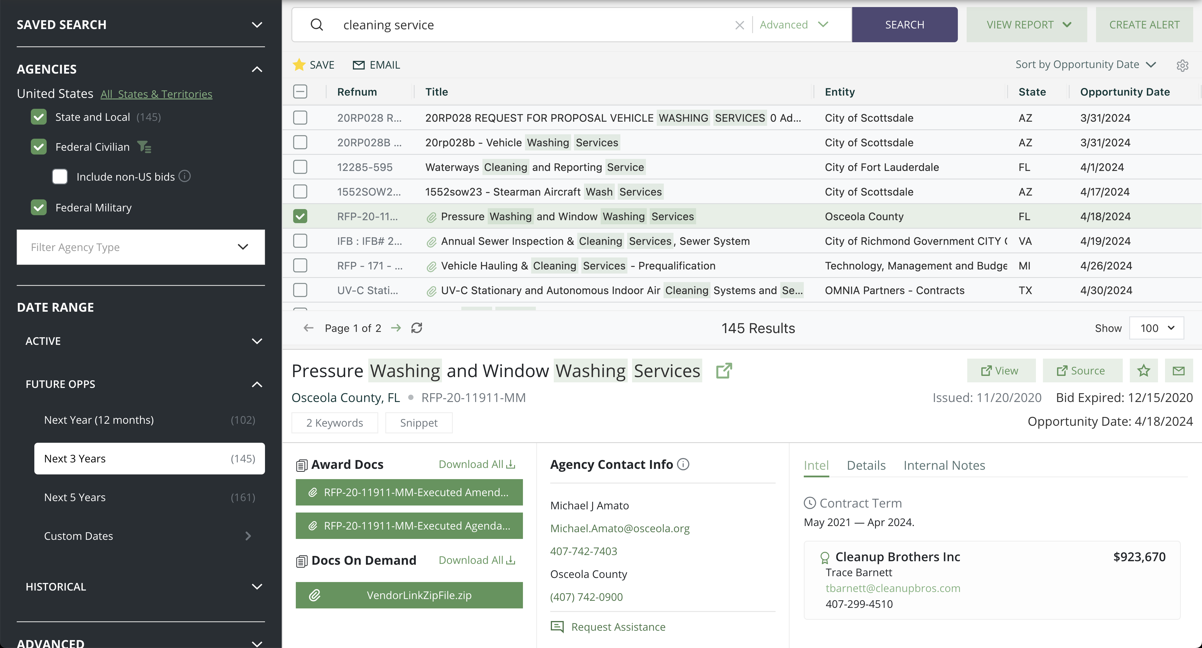 Term Contract details are often listed inside of bid and RFP specifications, including a Contract Start Date, Contract End Date, and Option periods. Future Opps leverages BidPrime’s leading repository of over 15 million bids and RFPs, extracting this key information related to contract periods. By extracting and sorting Contract End Dates and Contract Option terms, Future Opps predicts the likely next solicitation release period.