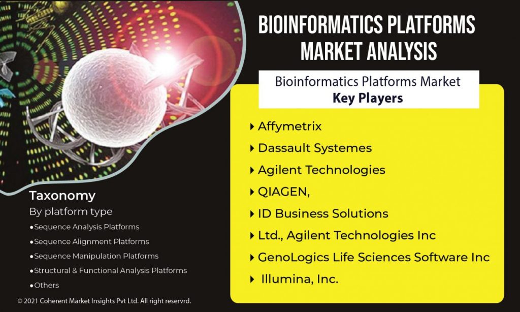 The major players covered in the Bioinformatics Platforms Market report are Affymetrix, Inc., Dassault Systemes, Agilent Technologies, QIAGEN, ID Business Solutions, Ltd., Agilent Technologies Inc., GenoLogics Life Sciences Software, Inc., and Illumina, Inc. among other domestic and global players. Market share data is available for Global, North America, Europe, Asia Pacific (APAC), Middle East and Africa (MEA) and South America separately. CMI analyst understands competitive strengths and provides competitive analysis for each competitor separately.