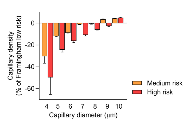 A total of 813 participants were included. The high-risk group (n = 168) was characterized by differences in the microvasculature compared with the low-risk group (n = 392): the high-risk group had a 49% reduction in the number of smallest capillaries and a 9.1-µm/s (95% CI: 5.2-12.9) higher red blood cell velocity in the feed vessels. No differences in velocity-corrected perfused boundary regions were found.