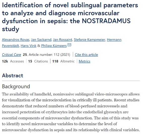 The study, titled Identification of novel sublingual parameters to analyze and diagnose microvascular dysfunction in sepsis: the NOSTRADAMUS study was published in Critical Care. Critical Care is a peer-reviewed, international clinical medical journal that provides a comprehensive overview of the intensive care field. One of the co-authors of the study is Dr. Hans Vink, Chief Science Officer of BioRegenx.