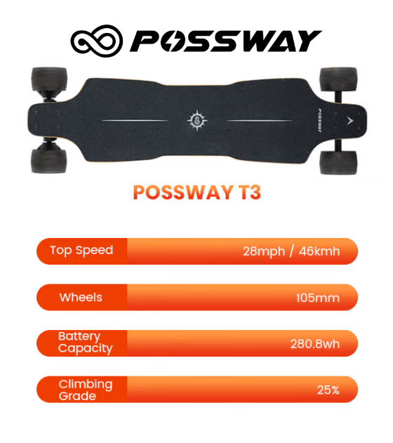 The Possway T3 is an excellent electric skateboard. It’s quiet and has enough range and top speed to get riders to most places in a decent time. It’s also an excellent choice for eskate commuters looking for increased range and stability on poorly paved roads.