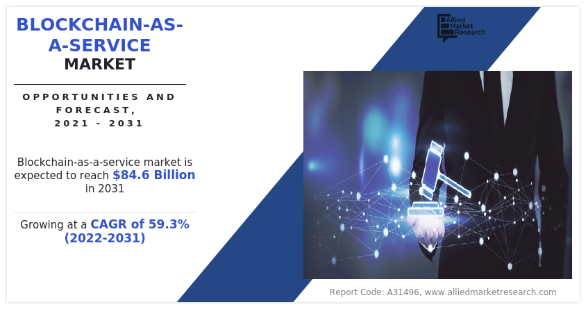 Blockchain-as-a-service market, which was valued at $828.96 million in 2021, is expected to have grown to $84.6 billion by 2031, with a compound annual growth rate (CAGR) of 59.3% between 2022 and 2031.