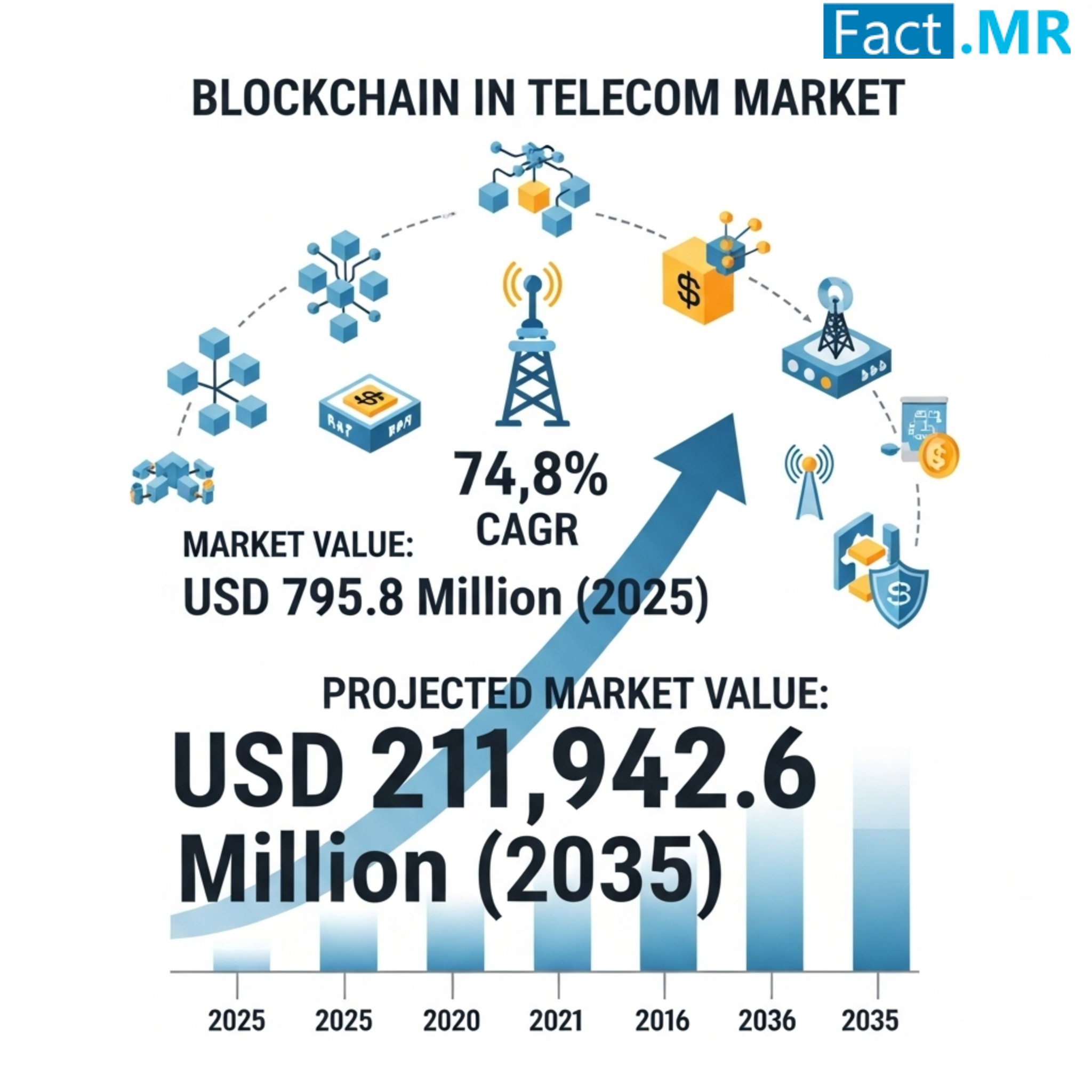 ROCKVILLE, MD, UNITED STATES, August 22, 2025 /EINPresswire.com/ — Fact.MR today released its latest report on the Blockchain in Telecom Market, providing comprehensive insights into the global market’s explosive growth driven by rising security concerns, increasing demand for fraud prevention, and the integration of blockchain with emerging technologies like 5G and IoT. Valued at USD 795.8 million in 2025, the market is projected to grow at a compound annual growth rate (CAGR) of 74.8%, reaching USD 211,942.6 million by 2035. This remarkable expansion highlights blockchain’s transformative potential in revolutionizing telecom operations and security.