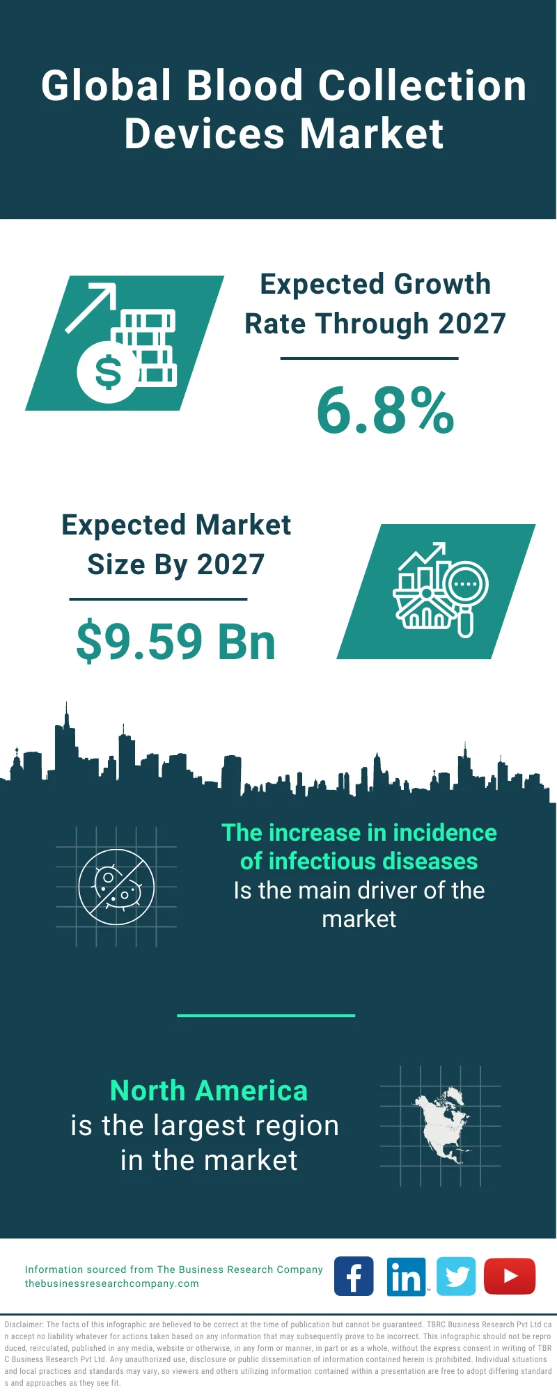 The growth in the blood collection devices market is due to the increase in incidence of infectious diseases. North America region is expected to hold the largest blood collection devices market share. Major players in the blood collection devices market include Becton, Dickinson and Company, Greiner Holding AG, Kabe Labortechnik GmbH, Sarstedt AG & Company, ICU Medical Inc., Terumo BCT Inc.