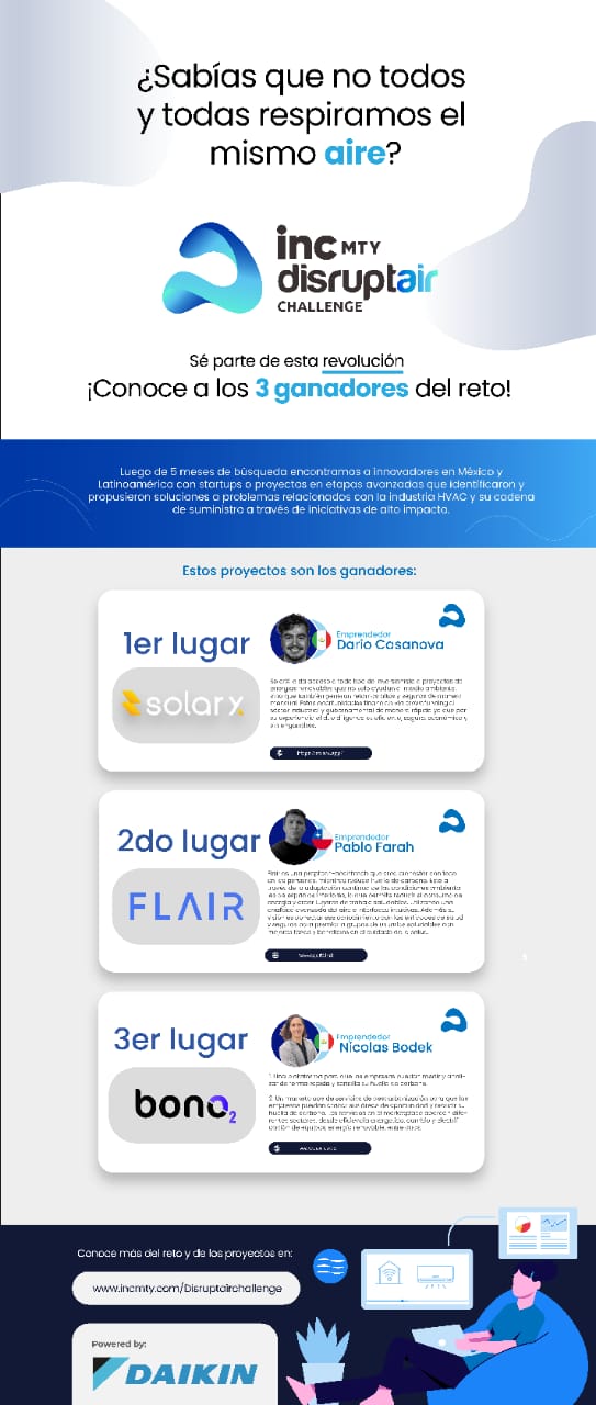 Daikin e INCmty se unieron para convocar a emprendedores y emprendedoras residentes en LATAM que cuenten con startups o proyectos en etapas avanzadas que identifiquen y resuelvan problemas relacionados con la industria HVAC y su cadena de suministro a través de iniciativas de alto impacto. Los participantes que llegaron a la gran final fueron Bono (Ciudad de México) y Flair (Chile) y Solar X (Monterrey). El emprendimiento ganador y acreedor de $150,000 MXN, un proceso de incubación acelerada y un viaje a Japón para establecer conexiones de valor es Solar X, liderado por Dario Casanova.