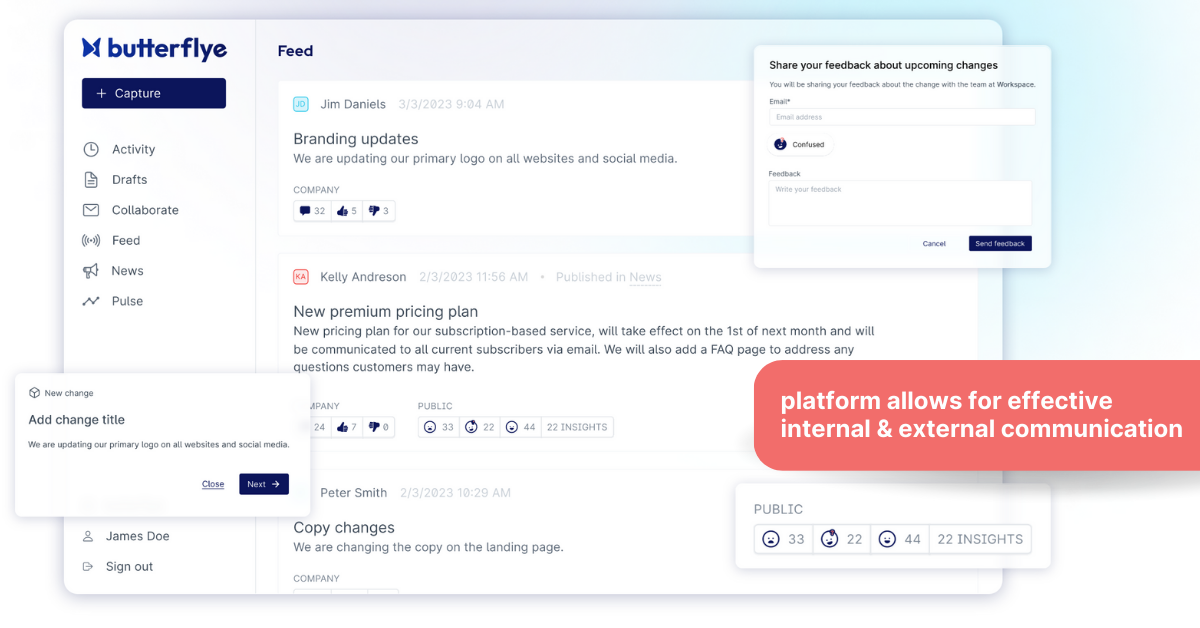 “The last mile of proactively communicating to stakeholders during the change management process has gone unaccounted for far too long,” said James Martin, CEO of Butterflye Solutions. “Our platform makes it easy for businesses to capture any and all changes, product updates, releases, and ideation within an organization, and collaborate seamlessly with internal stakeholders to ensure everyone is aligned and ensure that customers are always up-to-date on the latest developments.”
