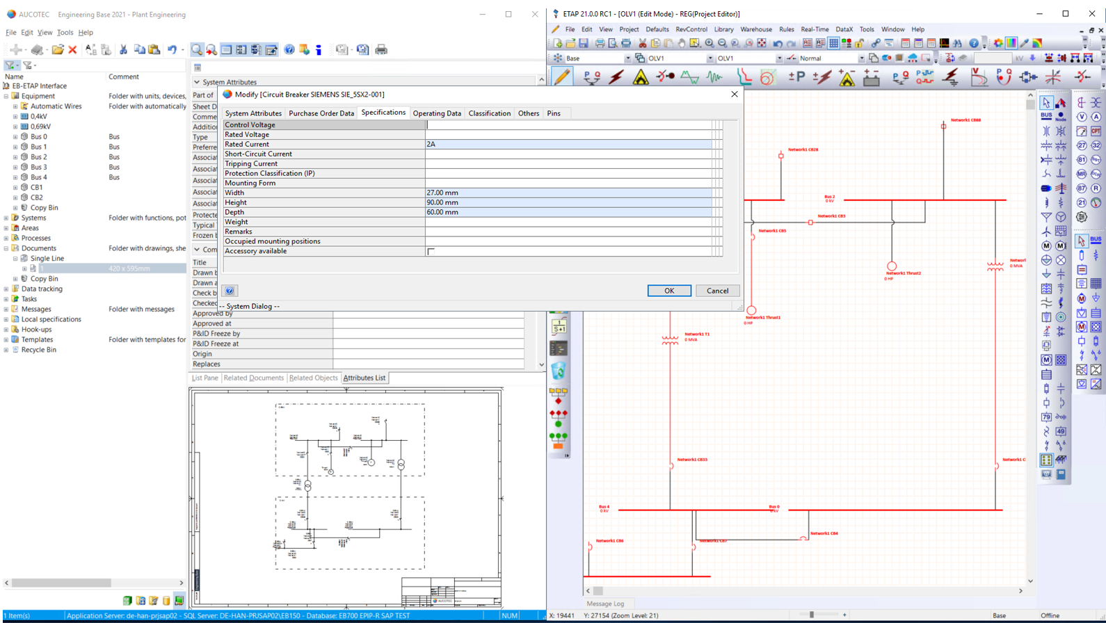 For example, the interface transforms a single-line diagram (SLD) from EB to ETAP at the push of a button into a tool-compatible representation that can be directly edited there and, if necessary, supplemented. After analysing and calculating the electrical specifications of the equipment defined in the SLD, such as cables, buses, circuit breakers and the like, the results are transferred back to the engineering platform via an EB wizard. EB augments the corresponding objects in the SLD with this data by mapping and supplementing the attributes. This causes the central data model of the (sub-)plant to grow and all those involved – including the instrumentation and automation specialists – can use all the details gained directly for their further processing.