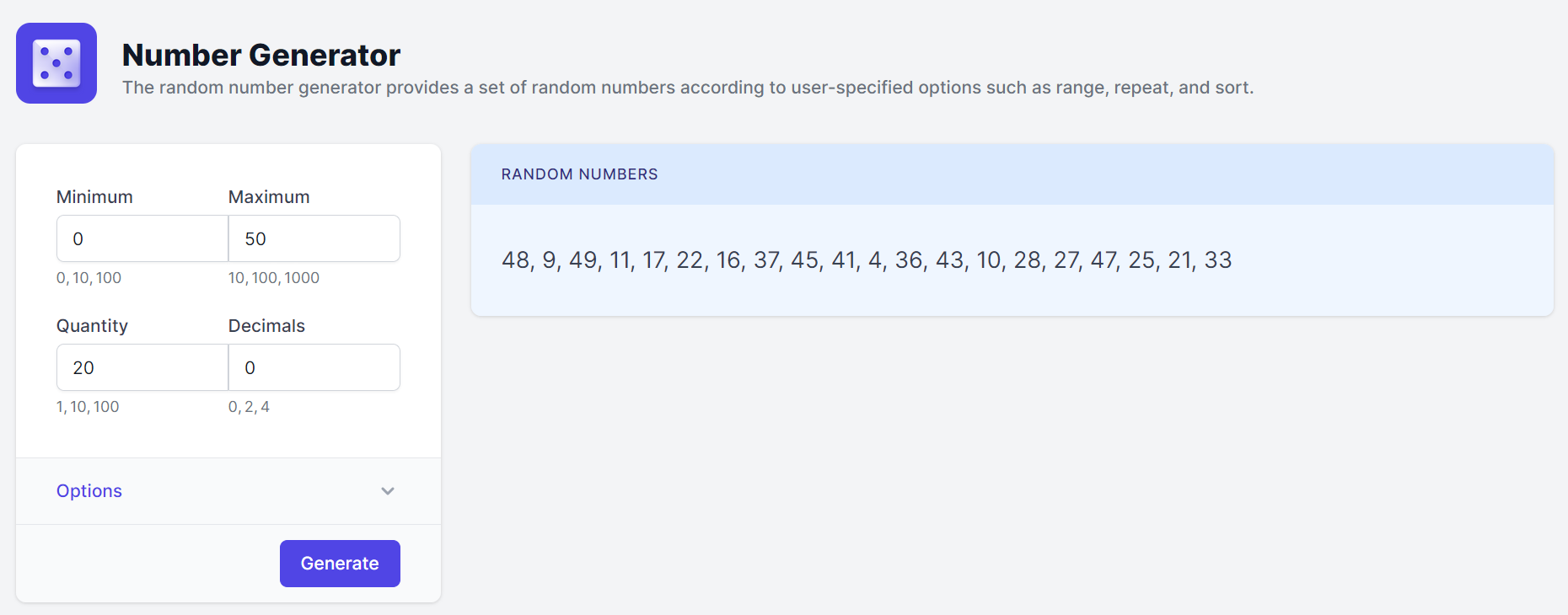 With a user-friendly interface, the Number Generator allows users to easily specify their desired range and quantity of numbers. The generator produces random numbers within the given range, ensuring unbiased results. As a web-based application, it can be accessed from any device with an internet connection, offering unparalleled convenience to users.