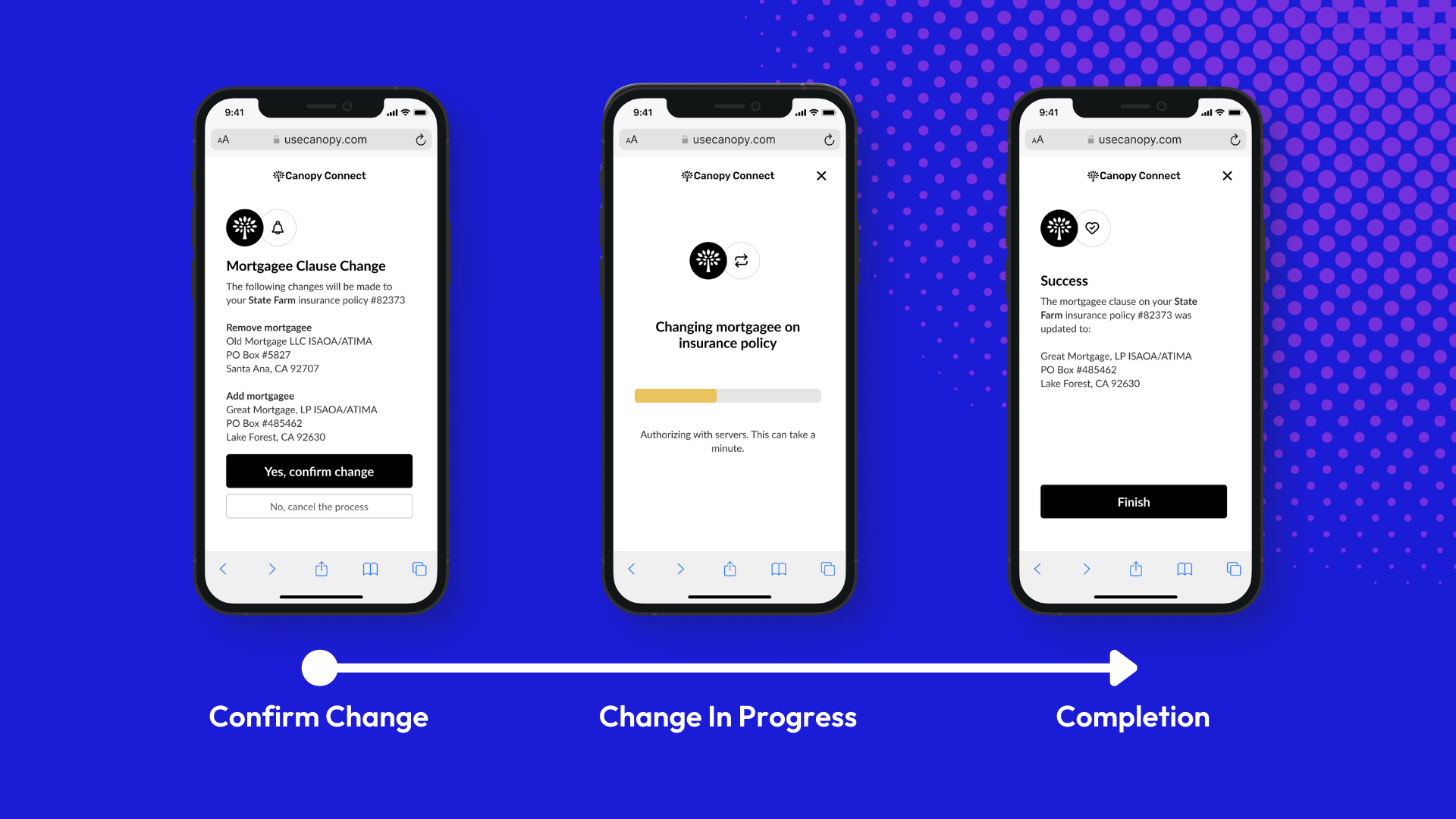 Canopy Connect’s mortgage solutions allows lenders and servicers to verify homeowners insurance information in seconds, then streamlines the process to add, edit, or remove a mortgagee from the policy through consumer authorization. Canopy Connect’s integrations cover over 91% of the homeowners insurance market. Learn more at: https://www.usecanopy.com/solutions/loan-servicing