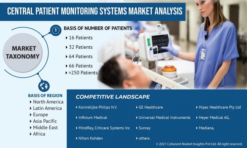 BURLINGAME, CALIFORNIA, UNITED STATES, February 28, 2023 /EINPresswire.com/ — The latest research report released by Coherent Market Insights on “Central Patient Monitoring Systems Market” analysis on business strategy taken up by emerging industry players, geographical scope, market segments, product landscape and value structure. It also assists in market segmentation according to the industry’s latest and upcoming trends to the bottom-most level, topographical markets, and key advancement from both market and technology-aligned perspectives. Each segment of the Central Patient Monitoring Systems Market business research report is specially prepared to investigate key aspects of the market. This document also entails a detailed analysis of the current applications and comparative analysis with a keen focus on the opportunities and threats and competitive analysis of major companies.