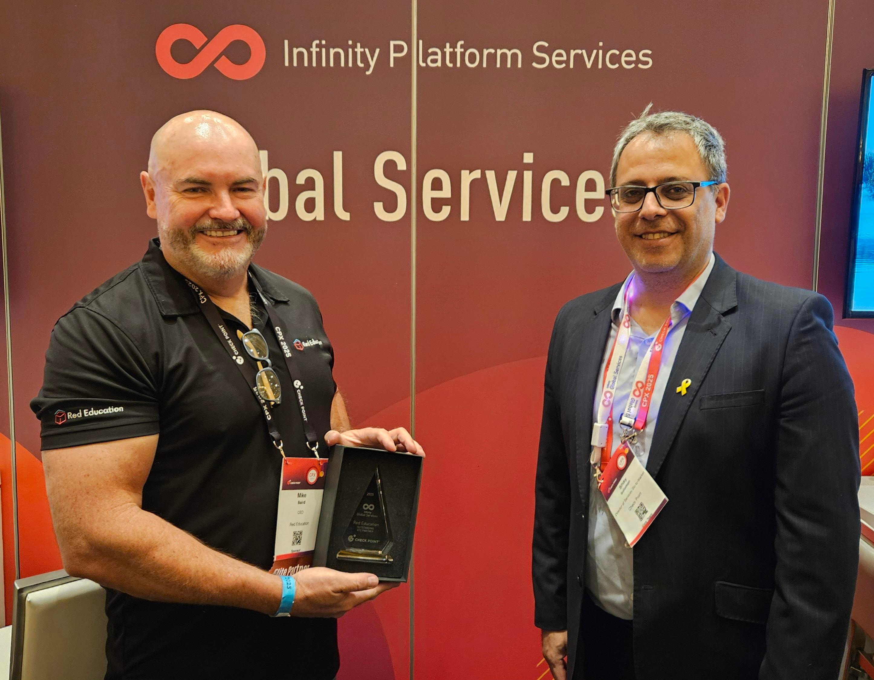 Mike Baird, CEO Red Education, receiving the Platinum Elite ATC Partner of the Year award from Shay Solomon, Director, Global Business Development and Cybersecurity Education at Check Point Software Technologies