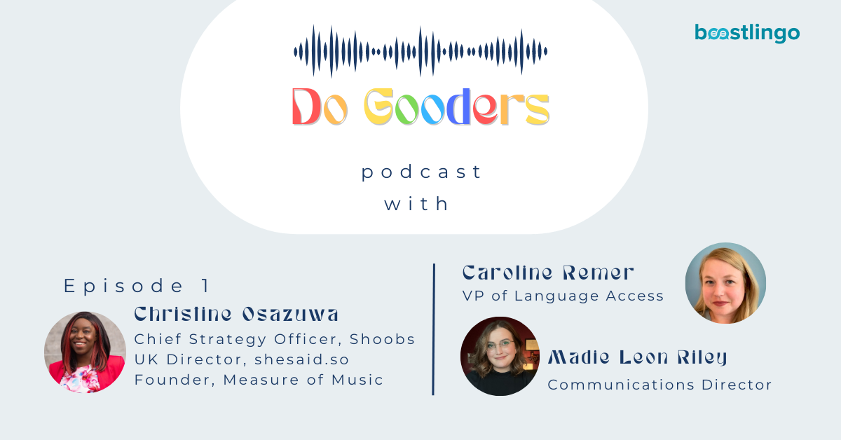 The Boostlingo podcast, Do Gooders, is a podcast asking the question, “Is it possible to do good with innovative technology, and if so, how?” Episodes leading up to the SXSW meetup will feature other women in tech who are changemakers in their spaces. The podcast will be hosted bi-weekly by Leon Riley and Boostlingo VP of Language Access, Caroline Remer.