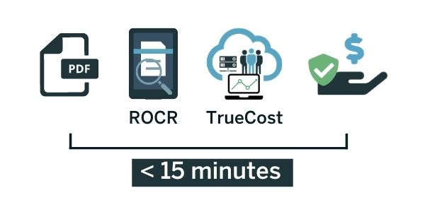 A key component in delivering a 15-minute audit is the advancement of the ClaimLogiq’s Rapid Optical Character Recognition tool, ROCR (pronounced rocker) which converts itemized bills from PDF to electronic format in minutes. The two technologies together, ROCR and TrueCost, are the ingredients that enable the 15-minute audit solution.