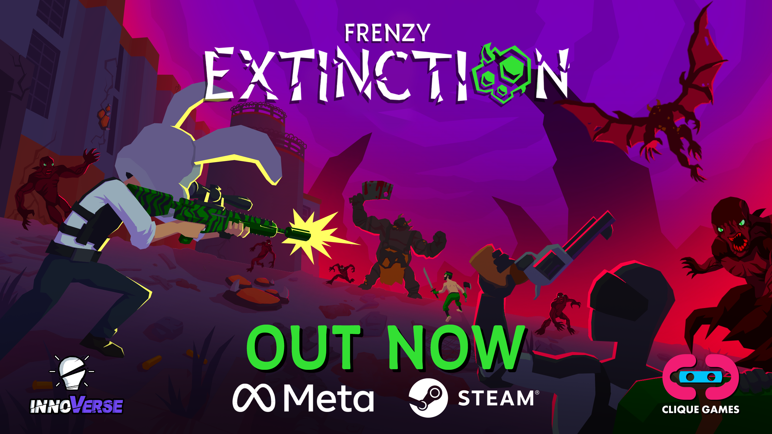 MENLO PARK, CA, UNITED STATES, September 12, 2024 /EINPresswire.com/ — Clique Games is excited to announce that Frenzy Extinction, developed by Innoverse Games, is now officially live on Meta and Steam. The highly anticipated sequel to Frenzy VR expands the franchise, bringing a deeper, more intense multiplayer survival experience to VR gamers worldwide. With enhanced gameplay, a deeper story, and the same physics-driven mechanics that made the original title a hit, Frenzy Extinction is not just a sequel—it’s the next chapter of the Frenzy universe.