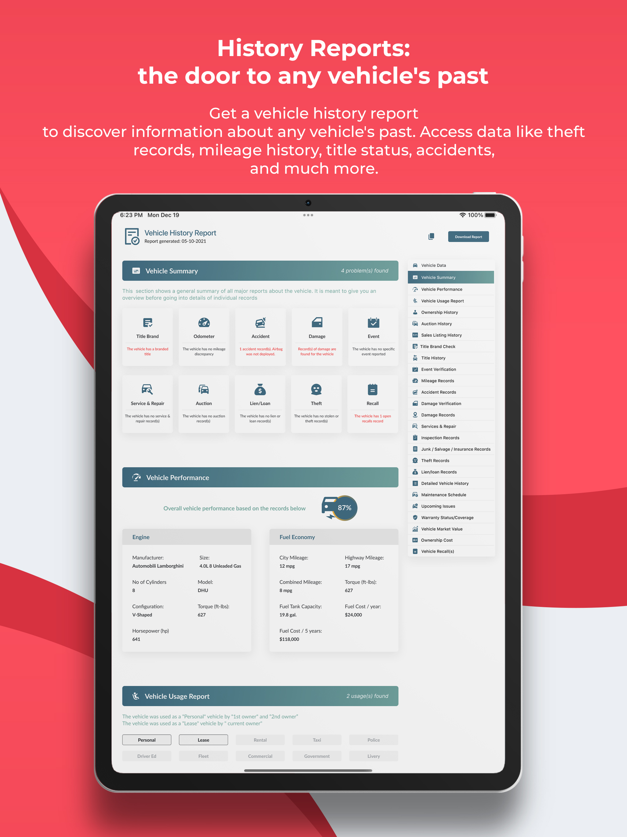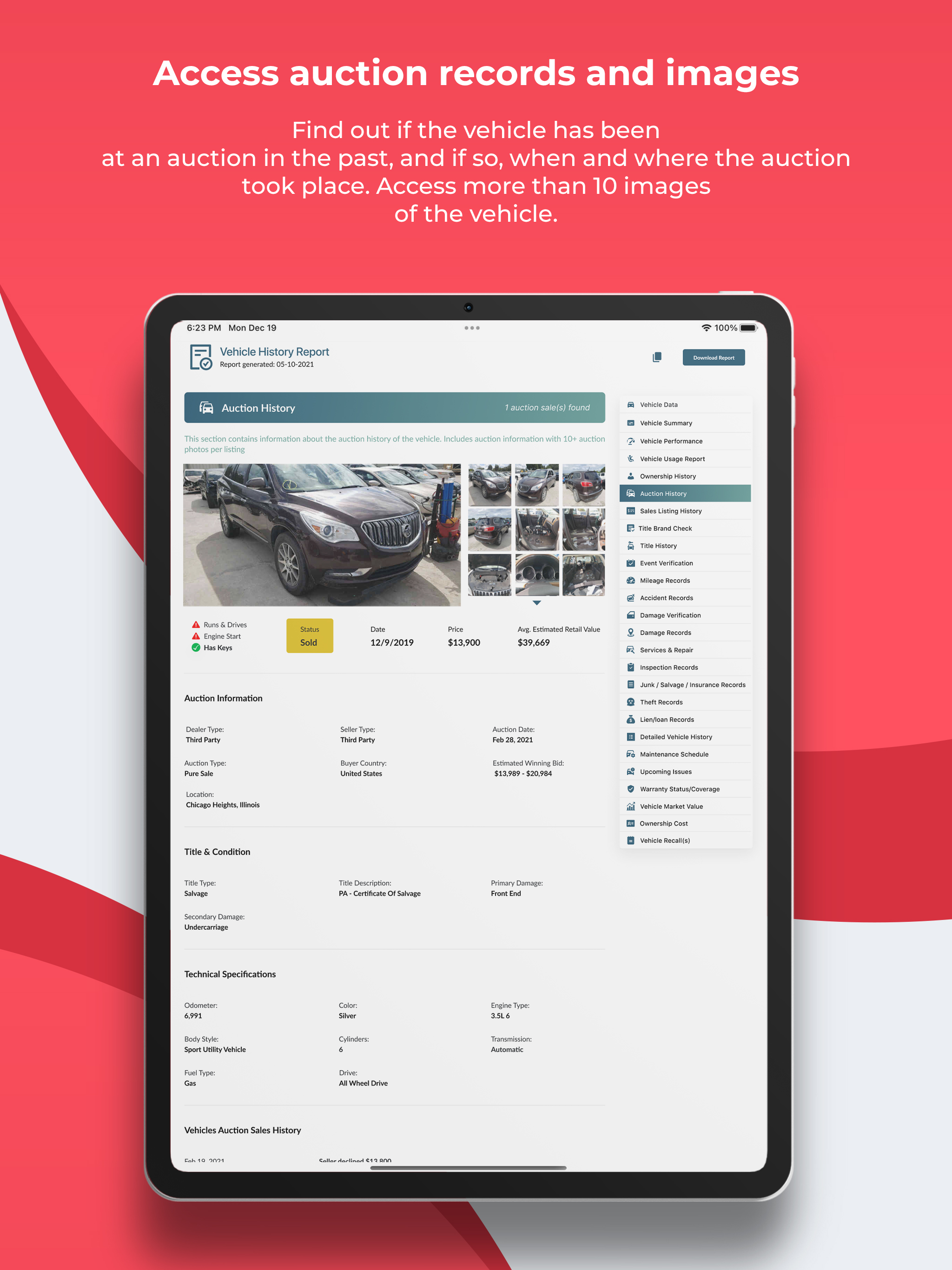 The vehicle history report provided by this mobile application is not just affordable but also more detailed compared to what is available elsewhere, therein lies the ownership history, title brand information, odometer rollback issues, theft records (if reported) auction data with 10+ plus photos (when available), inspection records, and service and repair history just to mention a but a few.