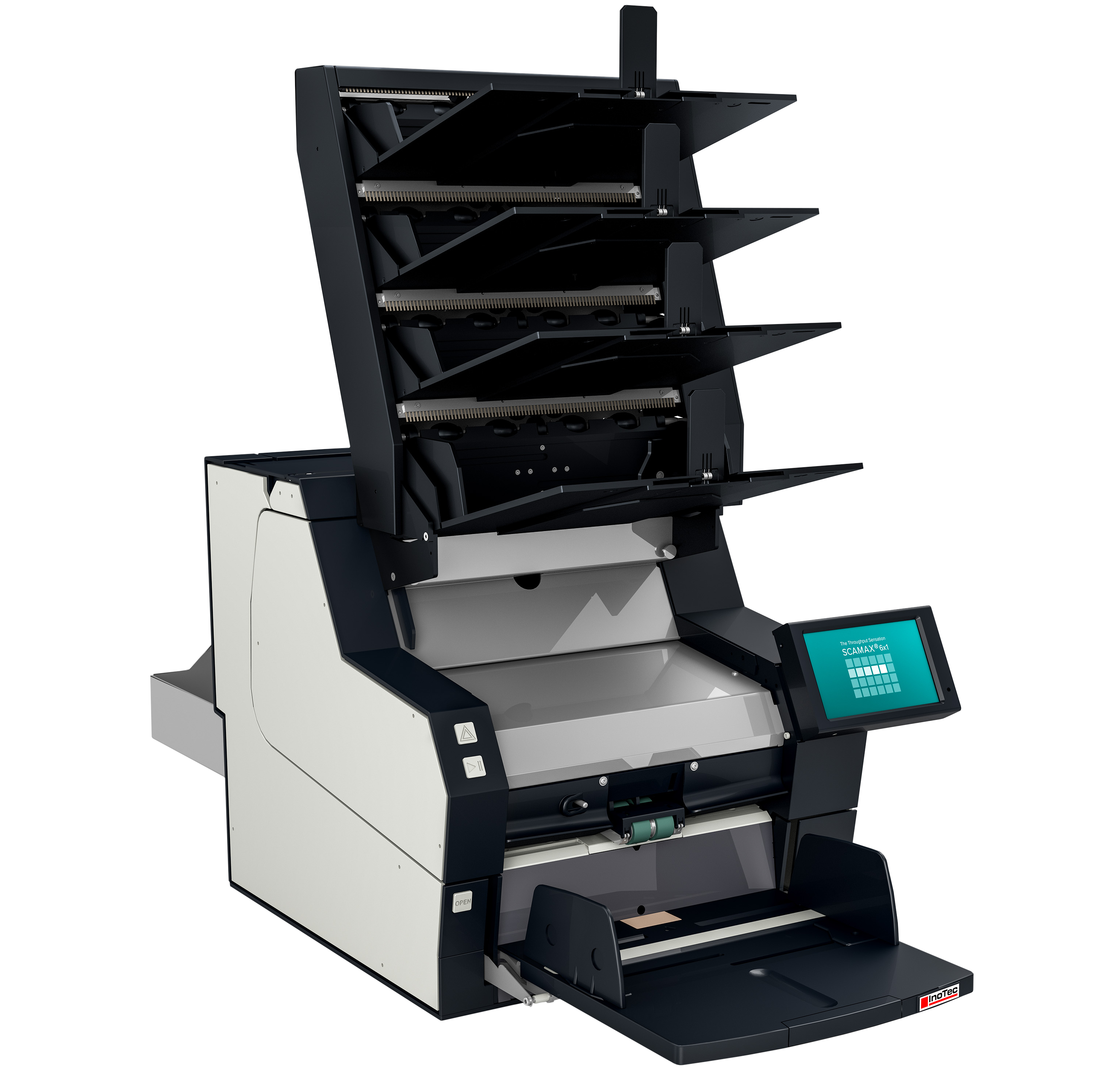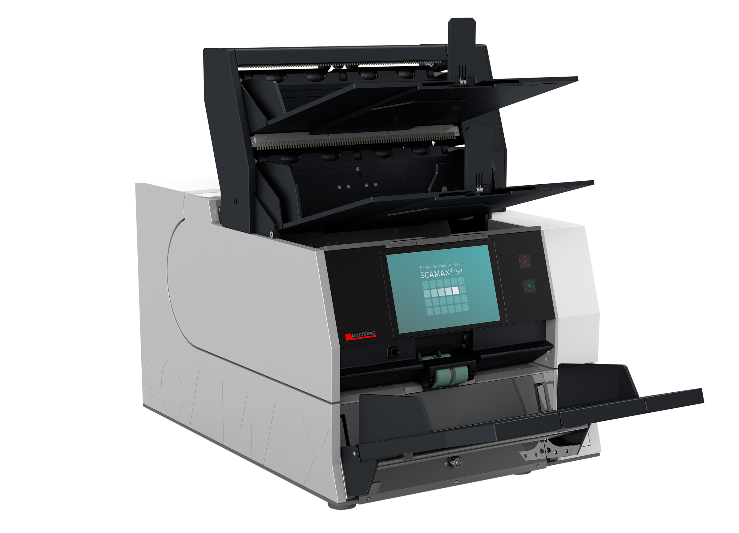As a hardware add-on, the SCAMAX® Sorter extends the award-winning InoTec document scanner series SCAMAX® 300-Series and SCAMAX® 600-Series to the most powerful sorting desktop document scanners on the global market. The sorting unit, which can be installed on-site, sorts documents in up to five output trays during the scanning process. The sorting decision is made on the basis of common sorting events and sorting criteria, be it patch code, barcode, document length, double sheet detection, database (CSV) or integrity detection. Depending on the scanning software used, sorting based on document content is also possible. This means that the SCAMAX® Sorter exceeds the sorting capacity of many stand-alone scanning devices.
